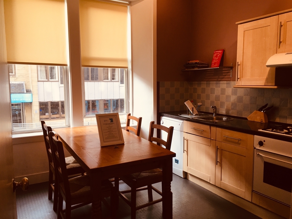 This flat is very comfortable and situated just a few yards off Edinburgh's famous 'Royal Mile'. This is a lovely, bright, 1st floor flat with one bedroom containing a standard size double bed and one double sofa bed in the lounge. The flat has a separate living room, separate kitchen, a bathroom with a shower and short bath and a large shared patio to the rear.