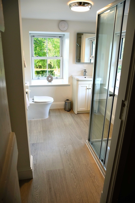 A convenient downstairs bathroom features WC, wash basin and large shower with low profile shower tray.