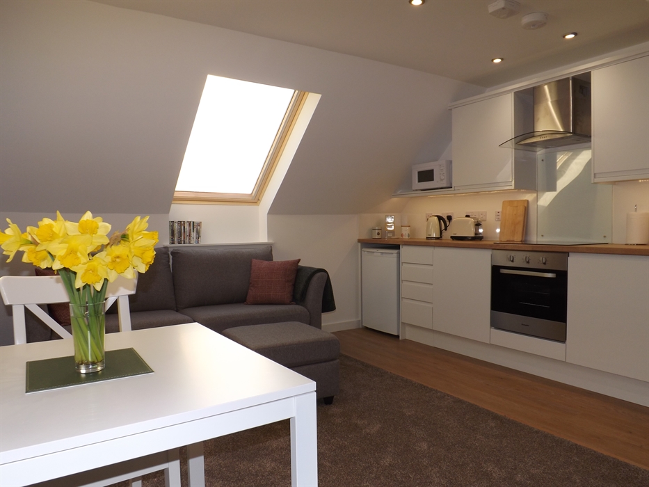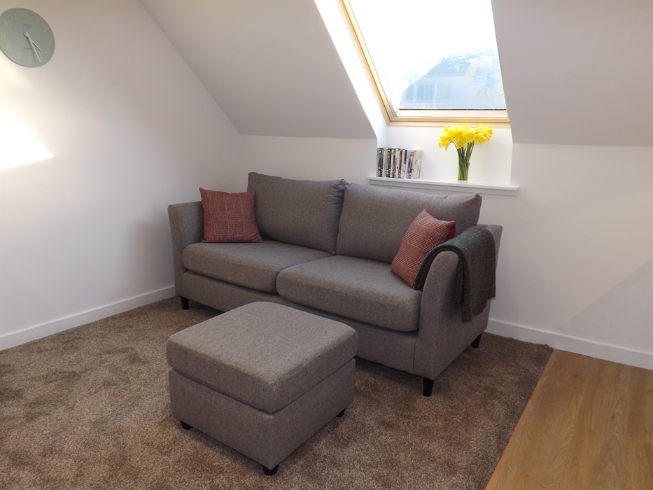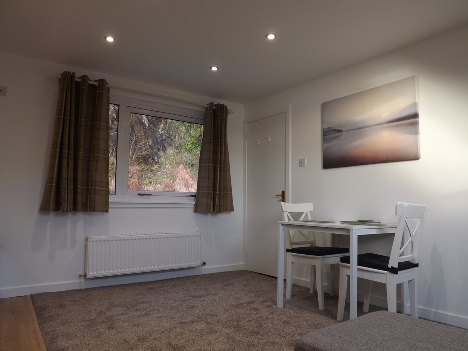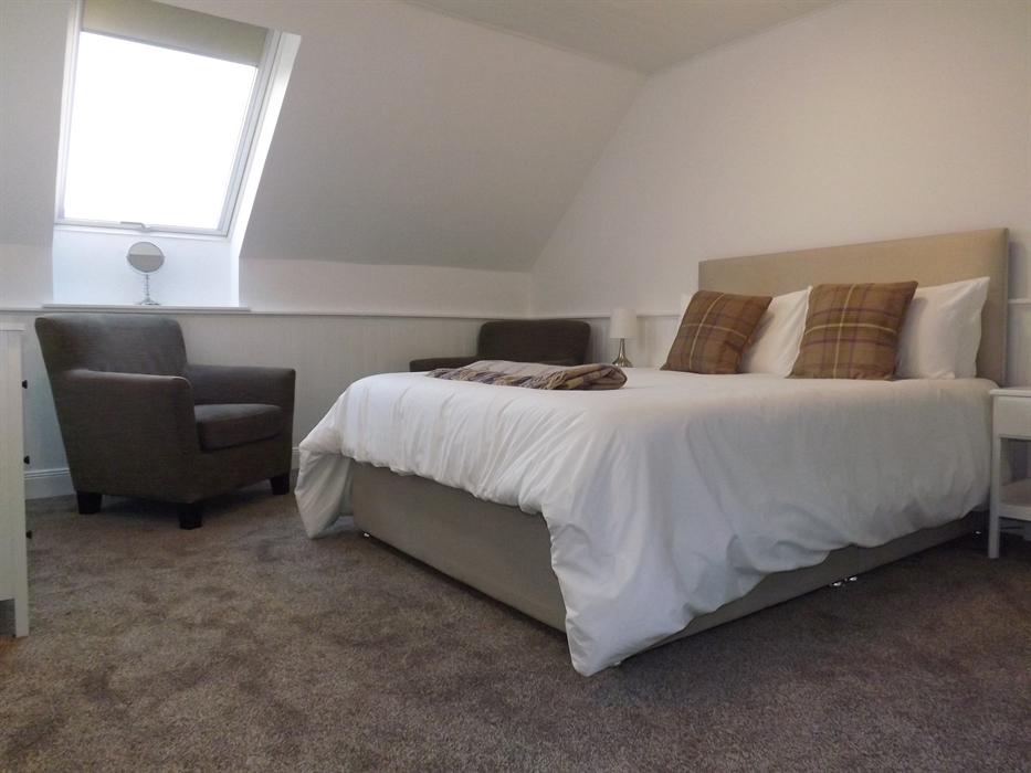Tigh Sgoile Loft is a one bedroom first-floor apartment, south facing, with a king-size bed, an en-suite shower room and a separate kitchen/dining and lounge room, also south facing.