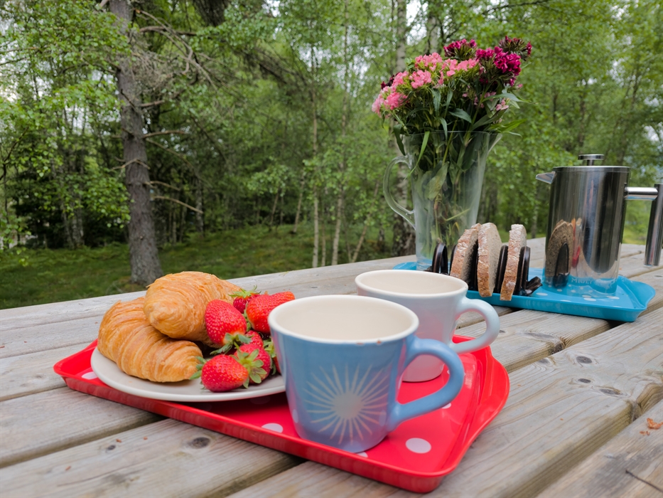 The home has a generously sized living room with views overlooking the birch forests through large glass windows and patio doors. There is a TV and a selection of interesting books. The fully equipped kitchen diner comfortably seats 6 guests and it leads out onto the outdoor veranda. Perfect for morning coffee sunrise with the birds or an evening meal enjoying the sunset.