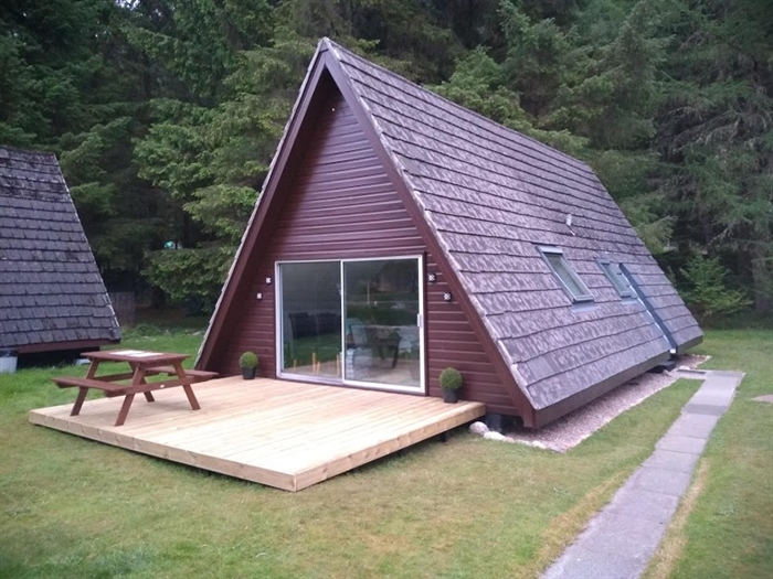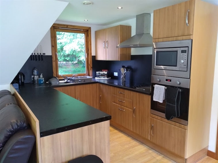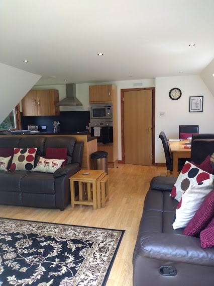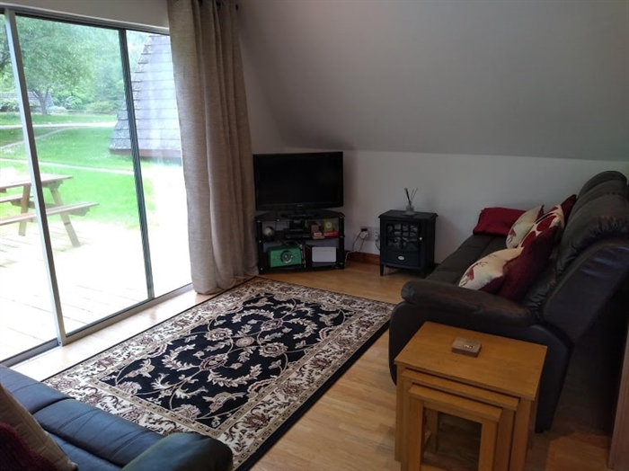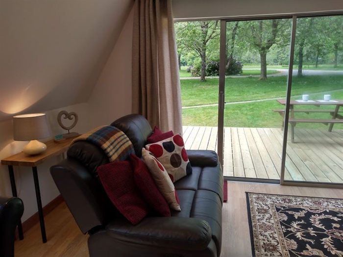 The Lodge is all on one level with three bedrooms and a central bathroom. The kitchen / dining / Living room is open plan and is a great space for socialising. The huge patio doors have views across the greenspace, with the Loch and trees beyond and they open to an outdoor decked area with table & chairs.