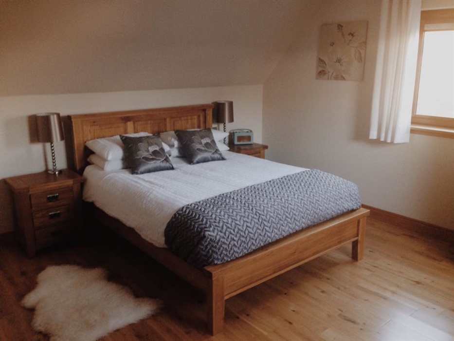 The bedroom at Tucked Away is a large warm, bright and charming room on the first floor with views of the surrounding crofts from the side window. The room is furnished in solid oak, painted in natural earthy colours and has a king size bed. There are gorgeous locally sourced sheepskin rugs on either side of the bed, a beautiful roberts radio to wake up to in the morning, a perfect way to start your day exploring the island.