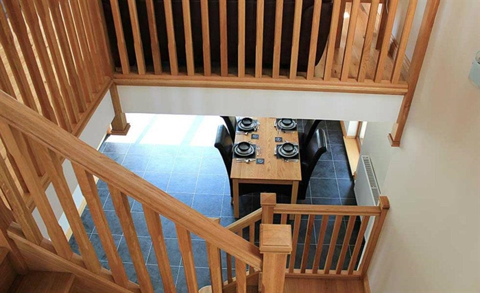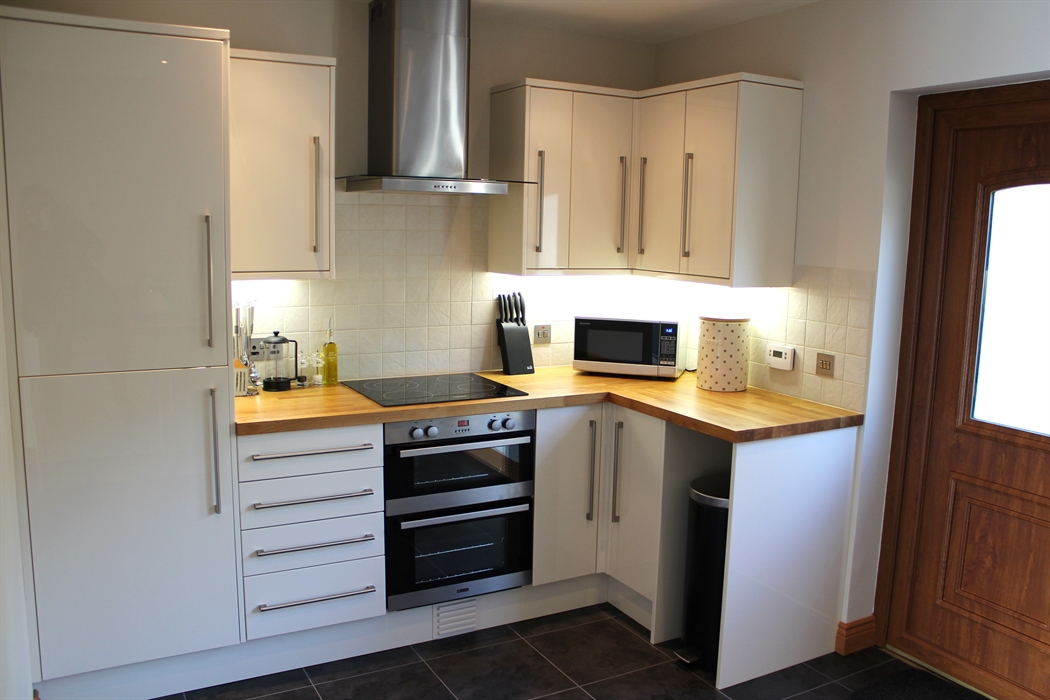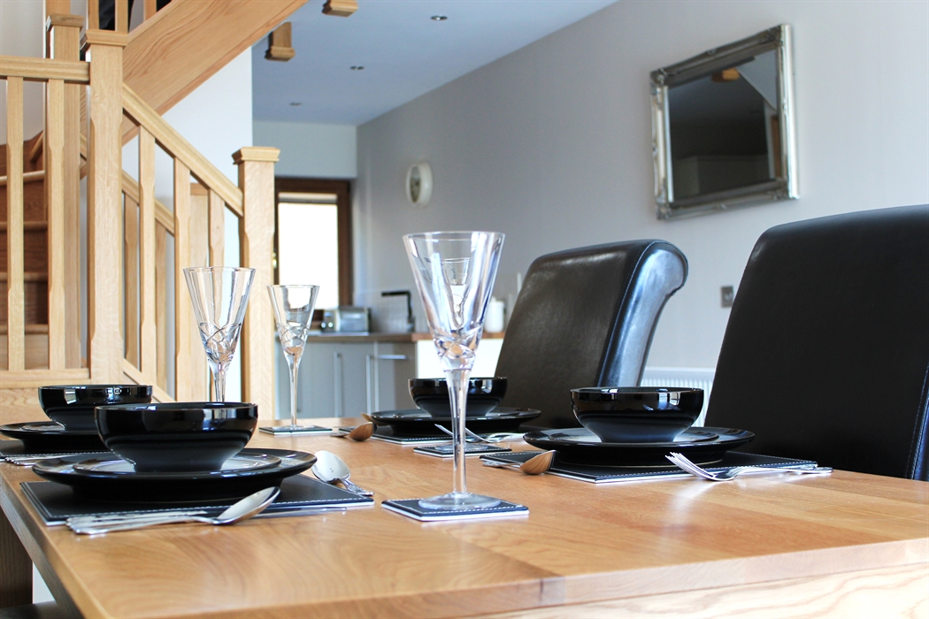 Downstairs the open plan kitchen and dining area spans the full length of the house. The kitchen is equipped with everything you need for a self catering trip including fully integrated kitchen appliances (fridge/freezer, dishwasher, washing machine/dryer, double oven/hob, microwave, etc) There is a full selection of crockery and utensils.