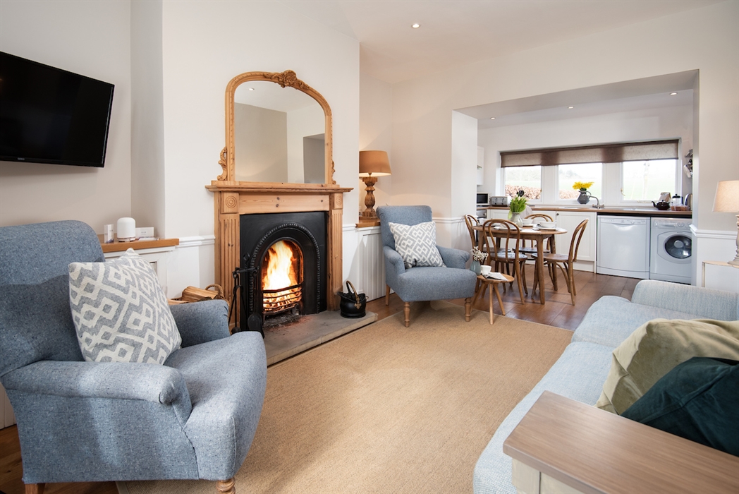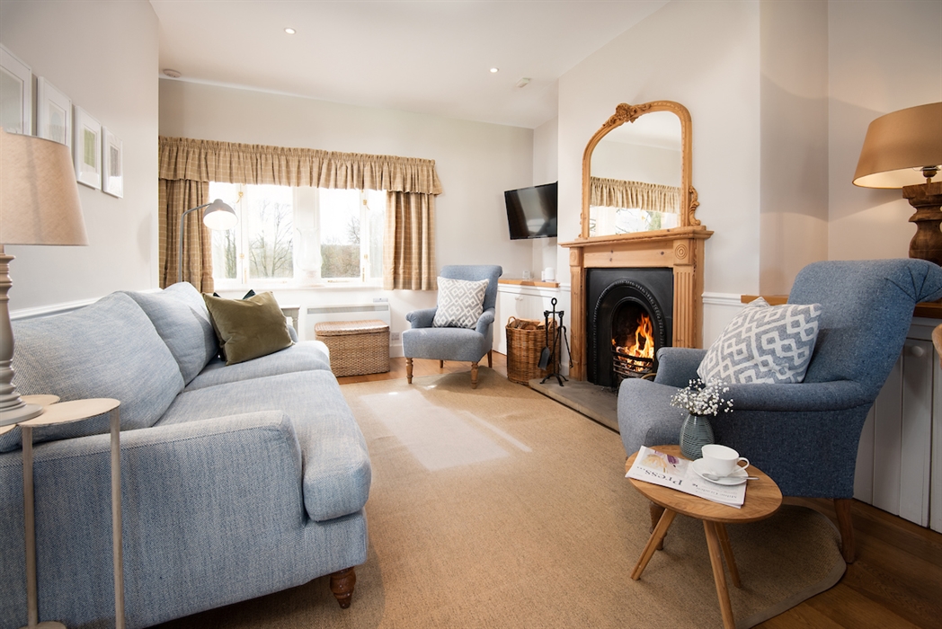 Sitting room with a large double sofa and two armchairs, open fire (ample supply of logs provided), large flat-screen TV with Freeview.