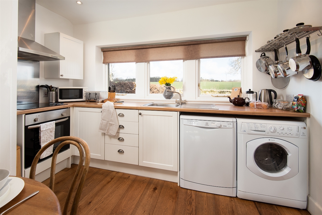 Fully equipped kitchen with stainless steel electric oven and hob, dishwasher, Nespresso Vertuo Pop Coffee Pod Machine, washing machine/dryer, and microwave.