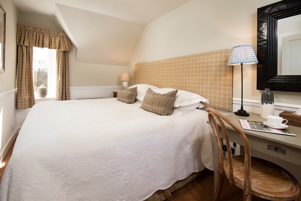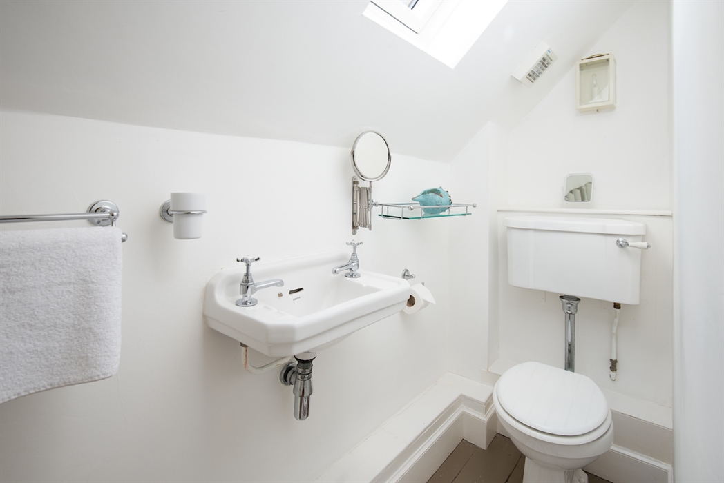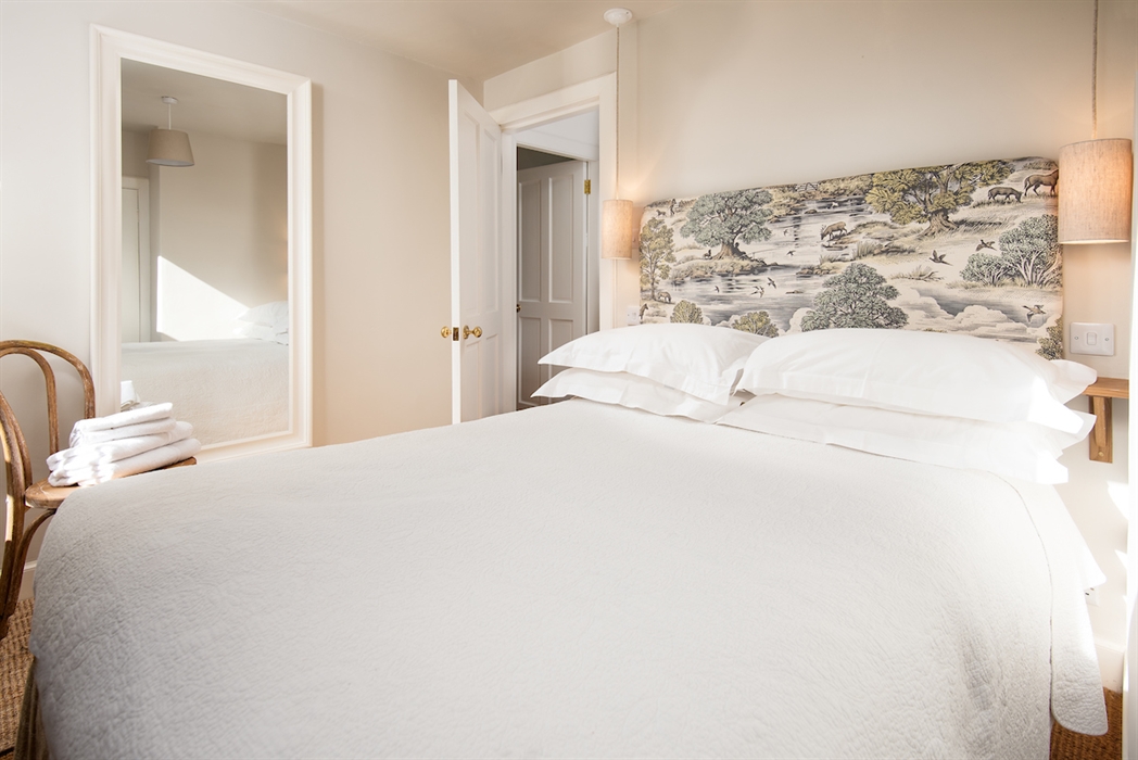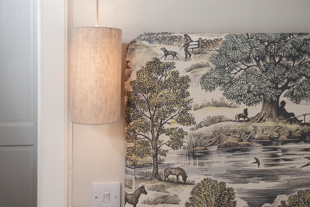Upstairs, the restful Skimming Stone colour scheme continues into the two compact but comfortable bedrooms - one zip and link, and one double. Headboards have been given a plush new look with carefully selected Royal Oak Lewis & Wood fabrics, matched with shades from Fermoie, Jim Lawrence pendant lighting, and punctuated by textured linen cushions from Oka.