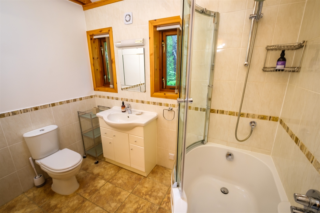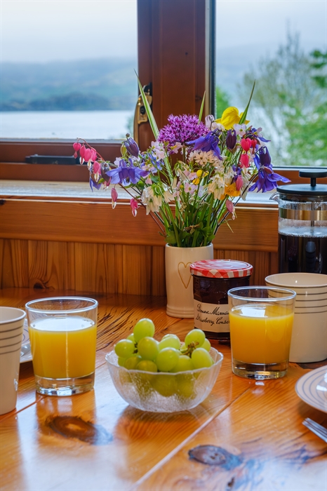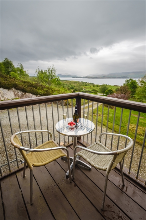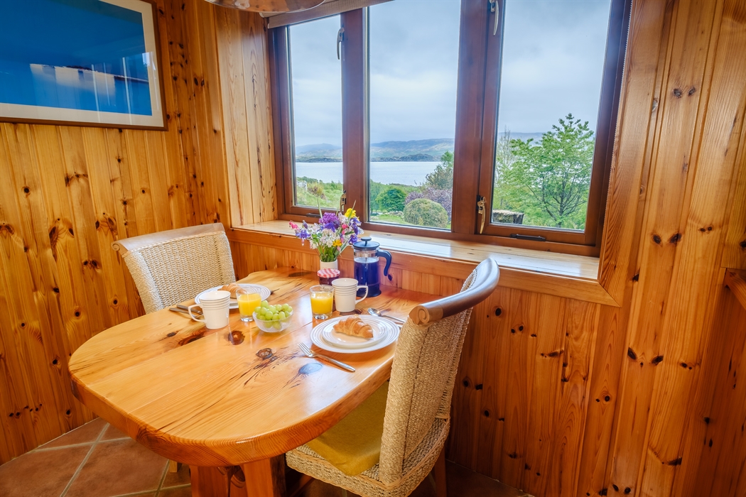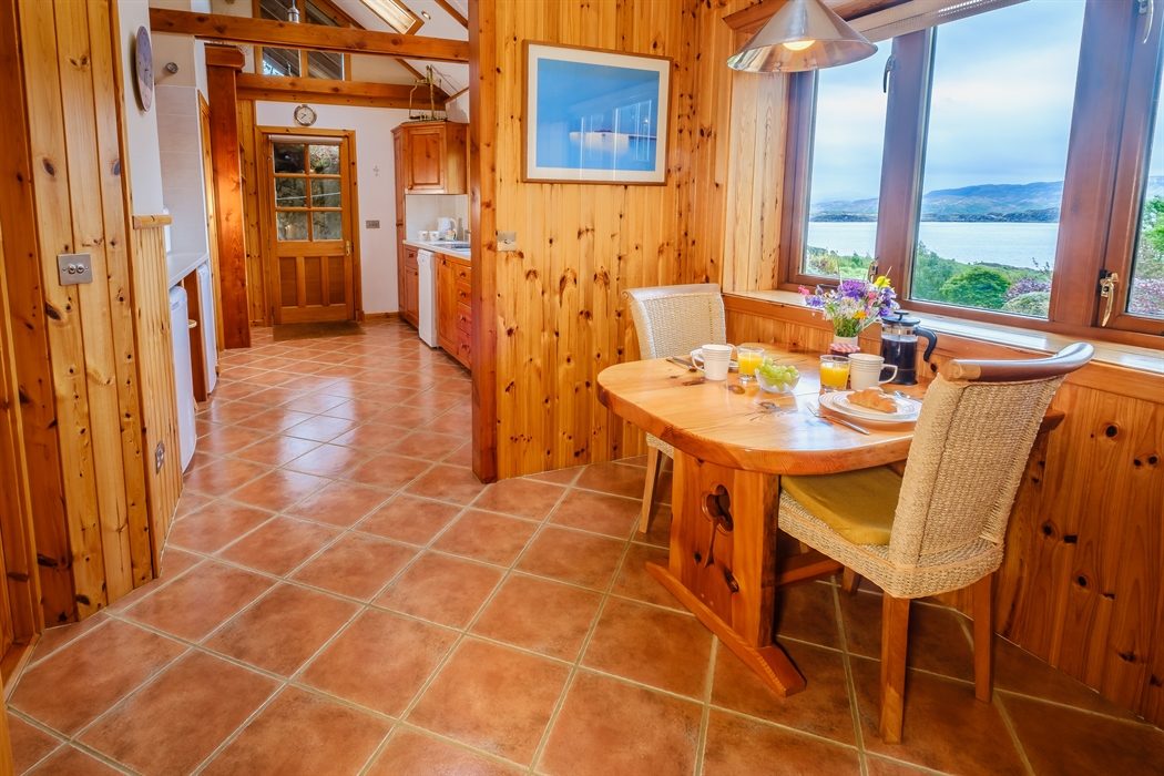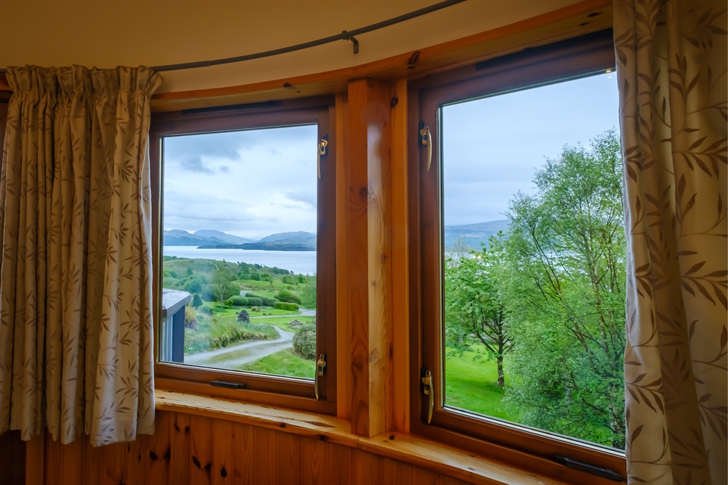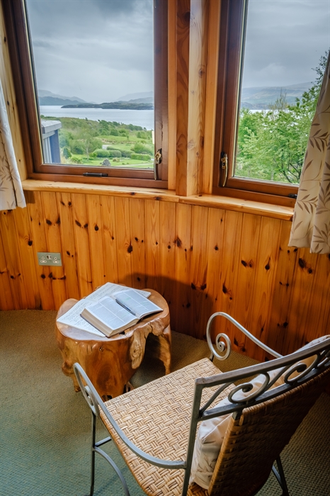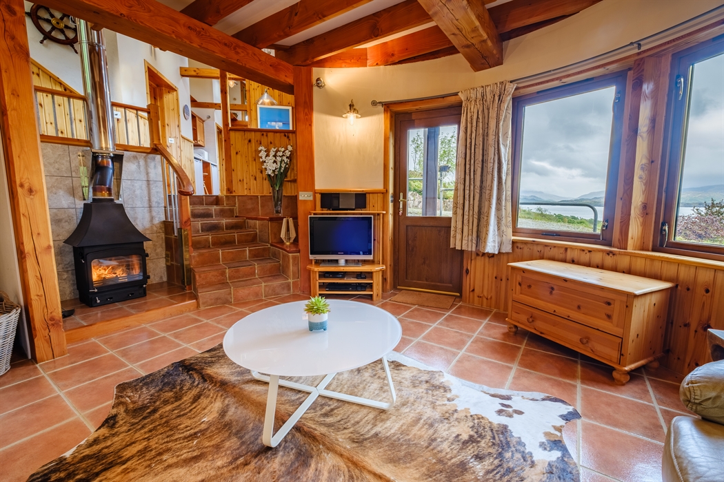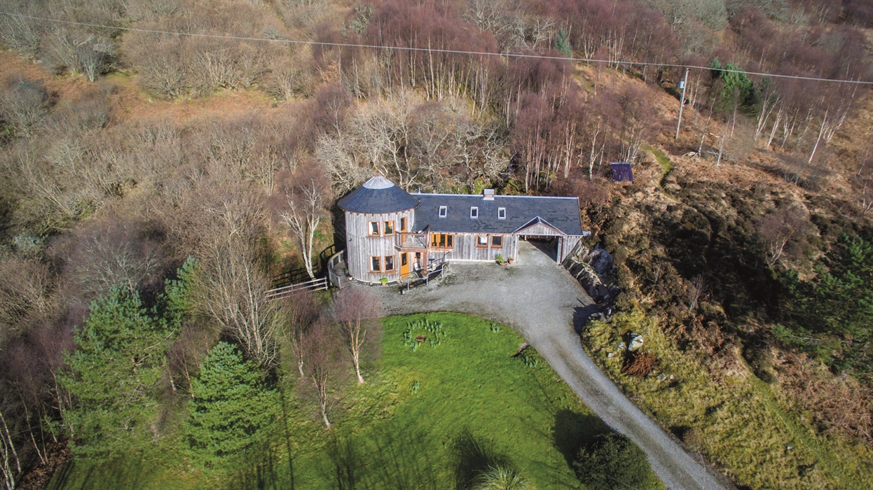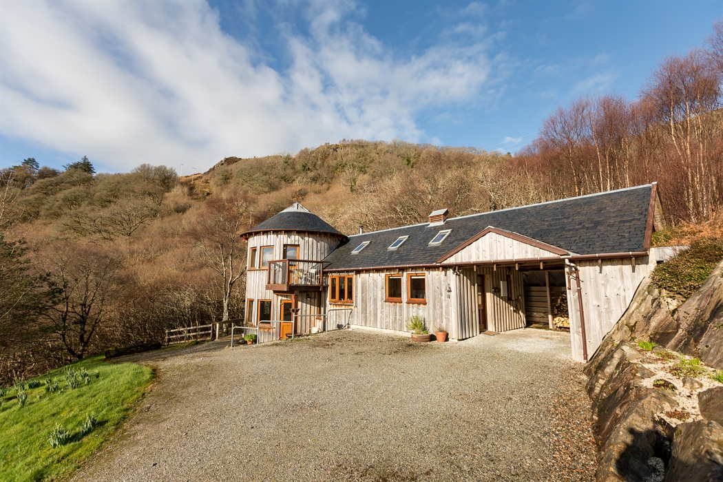 The kitchen, with adjacent utility and drying room, leads to an open plan dining area with superb views over the gardens, orchard and loch. There is a sizeable bathroom with large bath and shower. Down a short staircase opens into a delightful circular sitting room. Upstairs is the bedroom with super king bed and balcony. The front terrace and balcony soak up the sun during the day, while the evening sun is best enjoyed from the back deck, which is cantilevered over the burn.