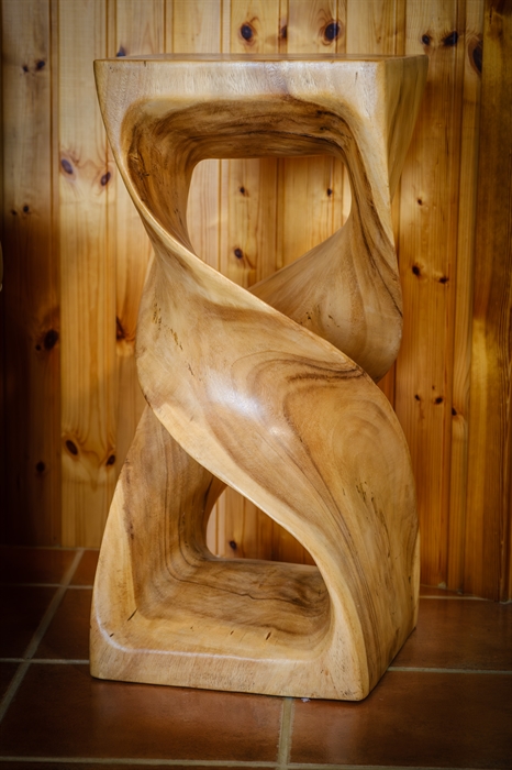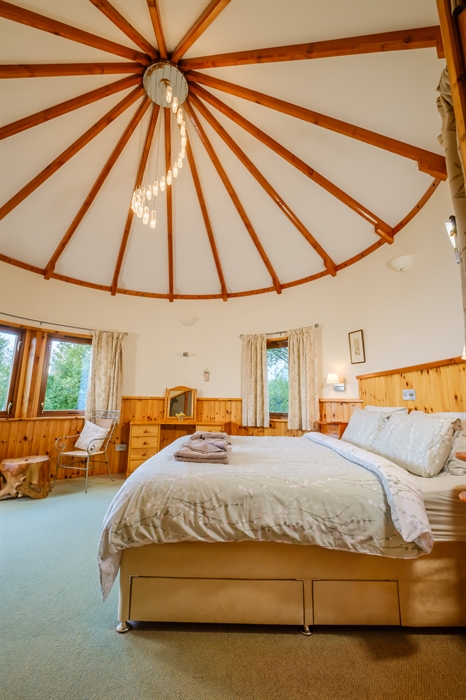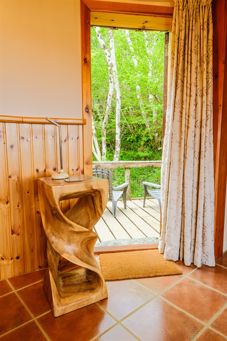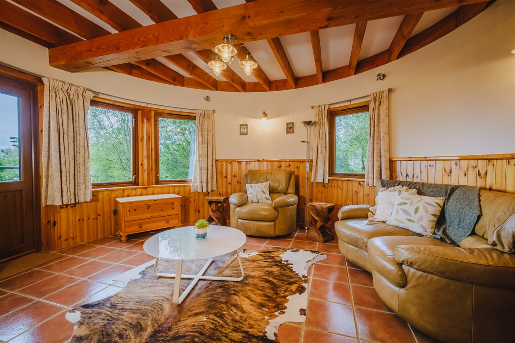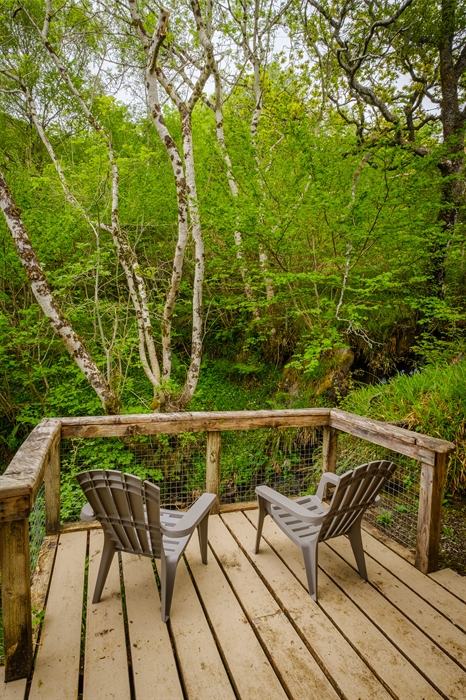This spacious cottage with circular living room and bedroom nestles into the rock and a picturesque waterfall with endless bubbling, living water. Clad in suitable Larch externally, with exposed beams made from local Douglas Fir on the inside, Uisge Bèo is at one with its woodland setting and certainly lives up to its name. Its high ceilings and turreted bedroom create a light and airy feel. While the under floor heating, beneath terracotta tiles, and a wood burning stove ensure things remain cozy. You will fall asleep and wake to the sound of the tumbling waterfall and sweet bird song.