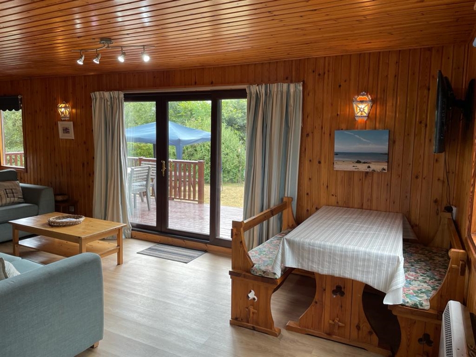 Accommodation for 4 across one floor: Three steps up to entrance; Open plan living/dining/kitchen area; French windows out onto veranda; Shower room with WC and wash basin; Twin bedroom; Double bedroom with ensuite bathroom with bath, WC and Wash basin; Outside utility room with washing machine; Garden (not fully enclosed) with patio, outdoor furniture, BBQ and Firepit; Outside parking for 2 cars
