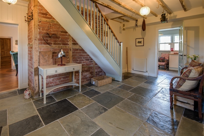 Inside, the spacious hallway creates a welcoming first impression with original oak beams, exposed brickwork, reclaimed church pews and characterful touches setting the scene for the rest of the house. The sitting room has a lovely vintage feel with an eclectic mix of rich tweeds, country florals and aged leather and wood for relaxed evenings around the huge inglenook fireplace.