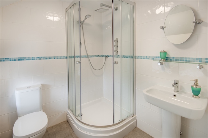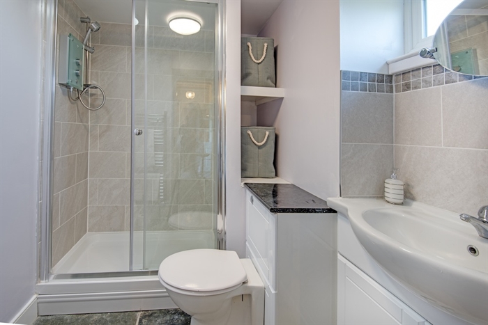 Family bathroom sits to the right of the lower entrance hall with shower, basin, WC and heated towel rail.