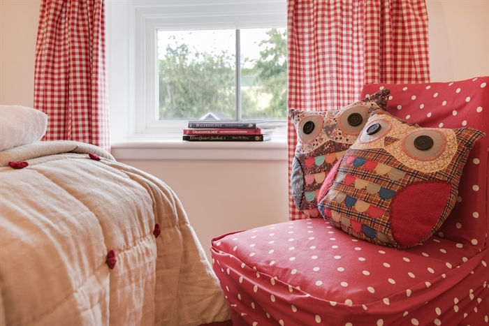 Bedroom with twin beds and a small child’s truckle bed. Hanging cupboard, chest of drawers, views to rear garden.