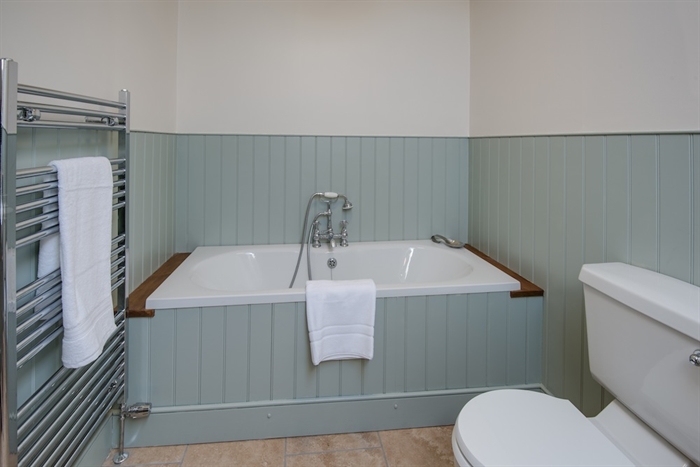Family bathroom with bath, handheld shower, basin, WC and heated towel rail.