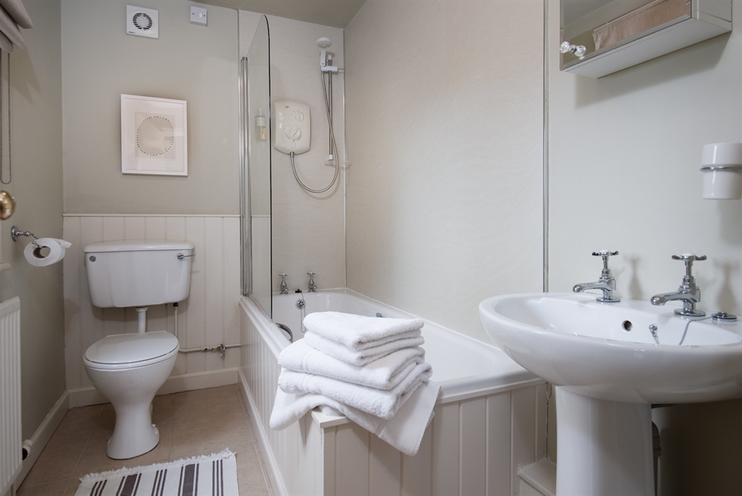 Family bathroom with bath with grab handle and shower over, heated towel rail, basin and WC.