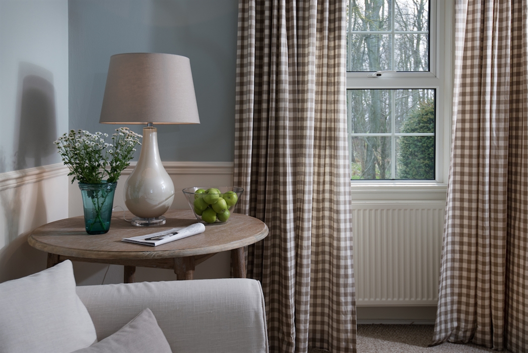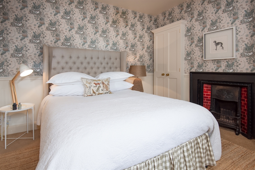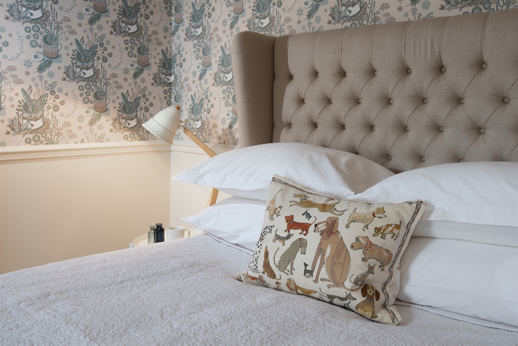 In the bedroom, designer of choice is Angie Lewin with feature wallpaper in ‘Nature’s Table’ and artwork by Yorkshire artist Emma Lawrenson. An oversized headboard in a biscuit colourway adds a luxury touch, while a peppering of soft furnishings will appeal to doggy lovers everywhere!