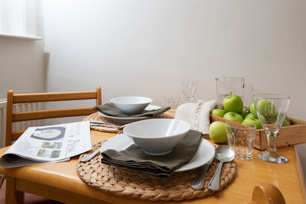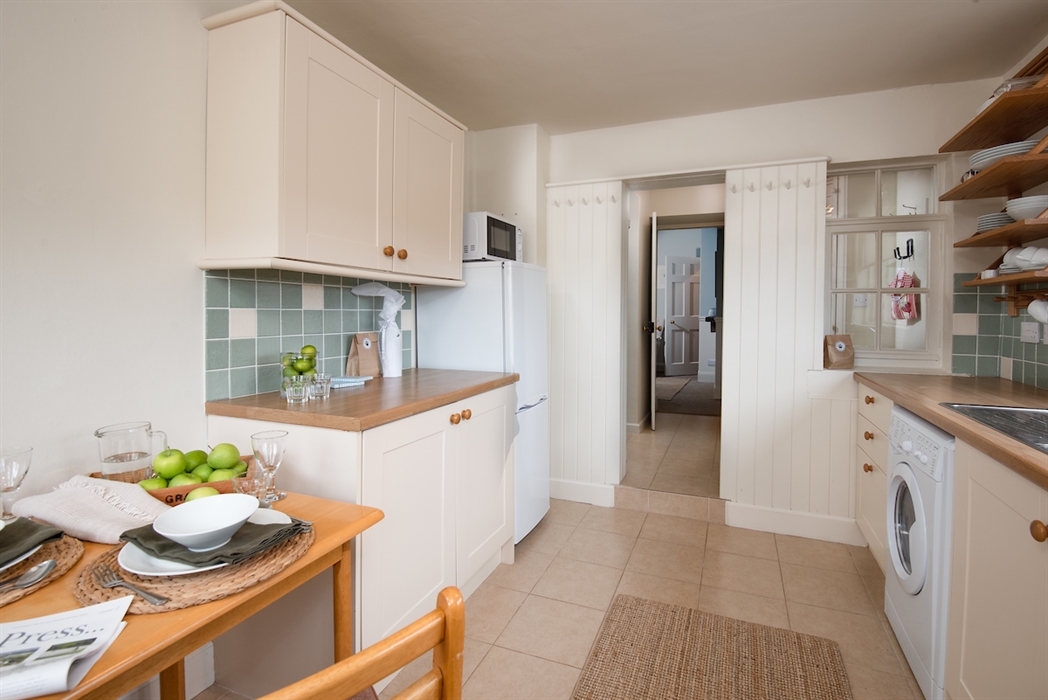 Kitchen with electric oven, electric hob, Dualit toaster, microwave, Nespresso Vertuo Pop Coffee Pod Machine, fridge / freezer and washing machine with dryer. Small dining table for two.