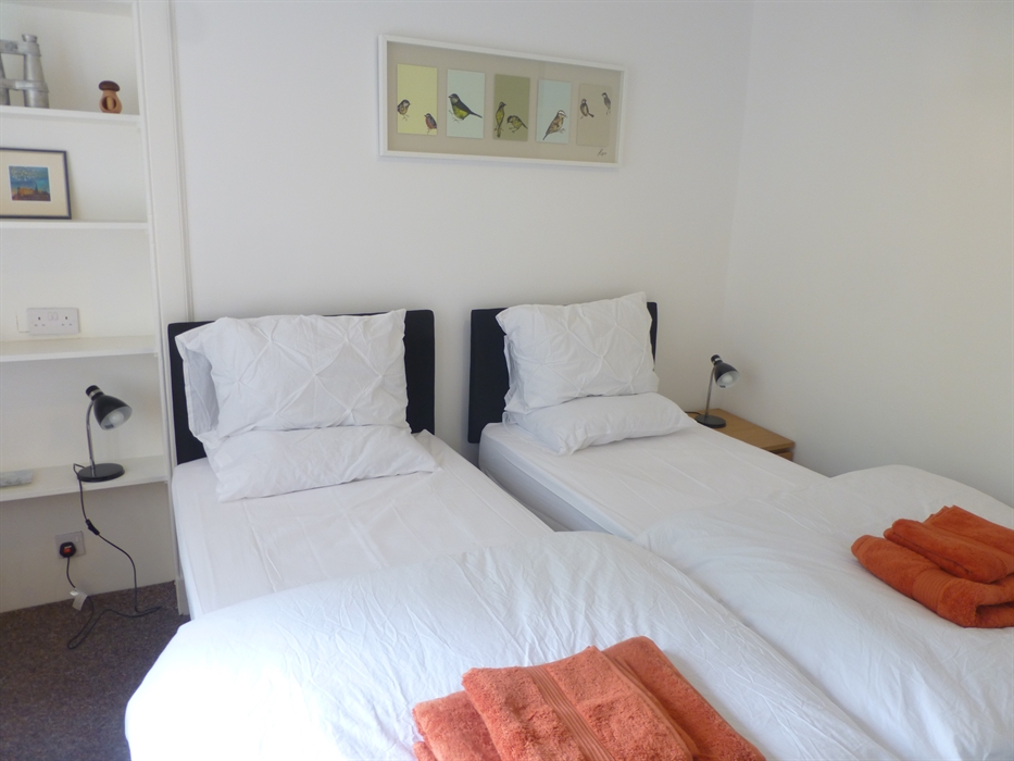 There are two bedrooms, each with two single beds. The shower-room is tiled and has a wash-hand basin, toilet and standard-size shower (no bathtub).