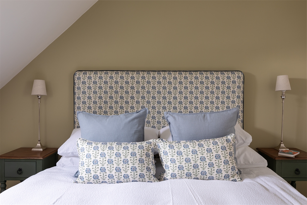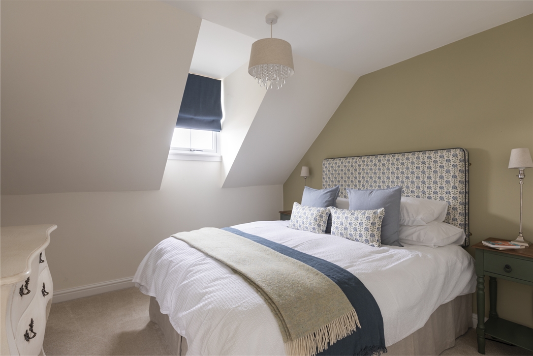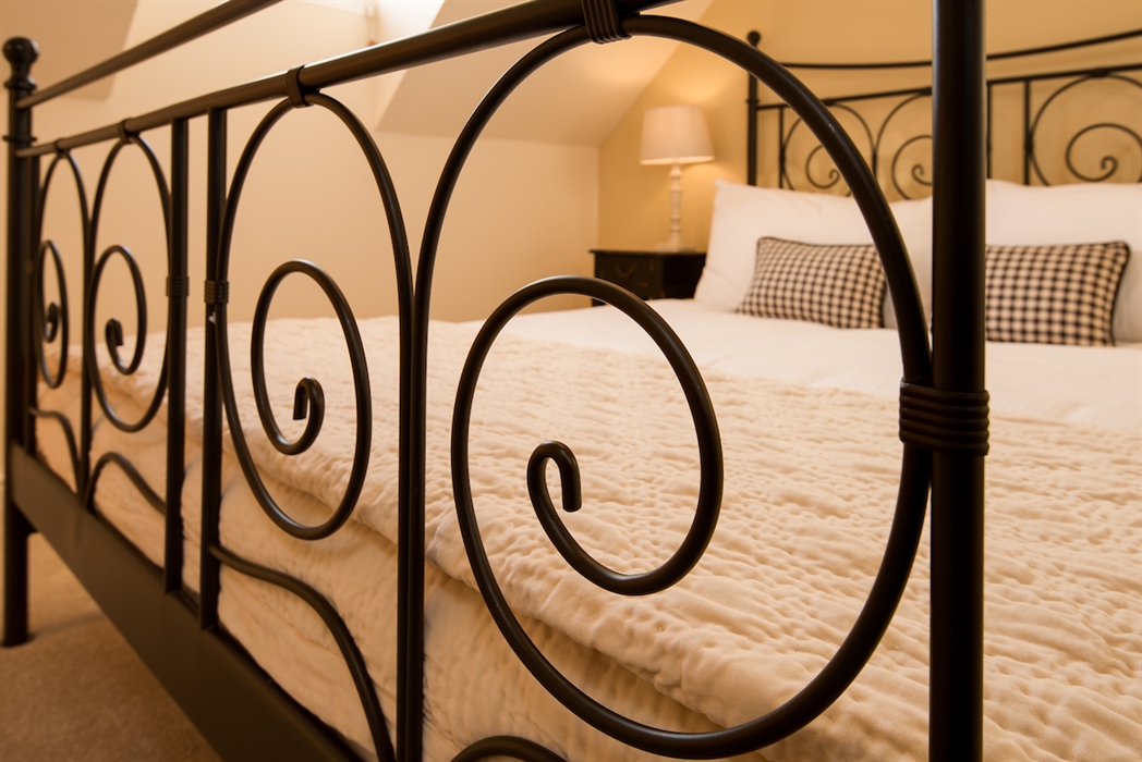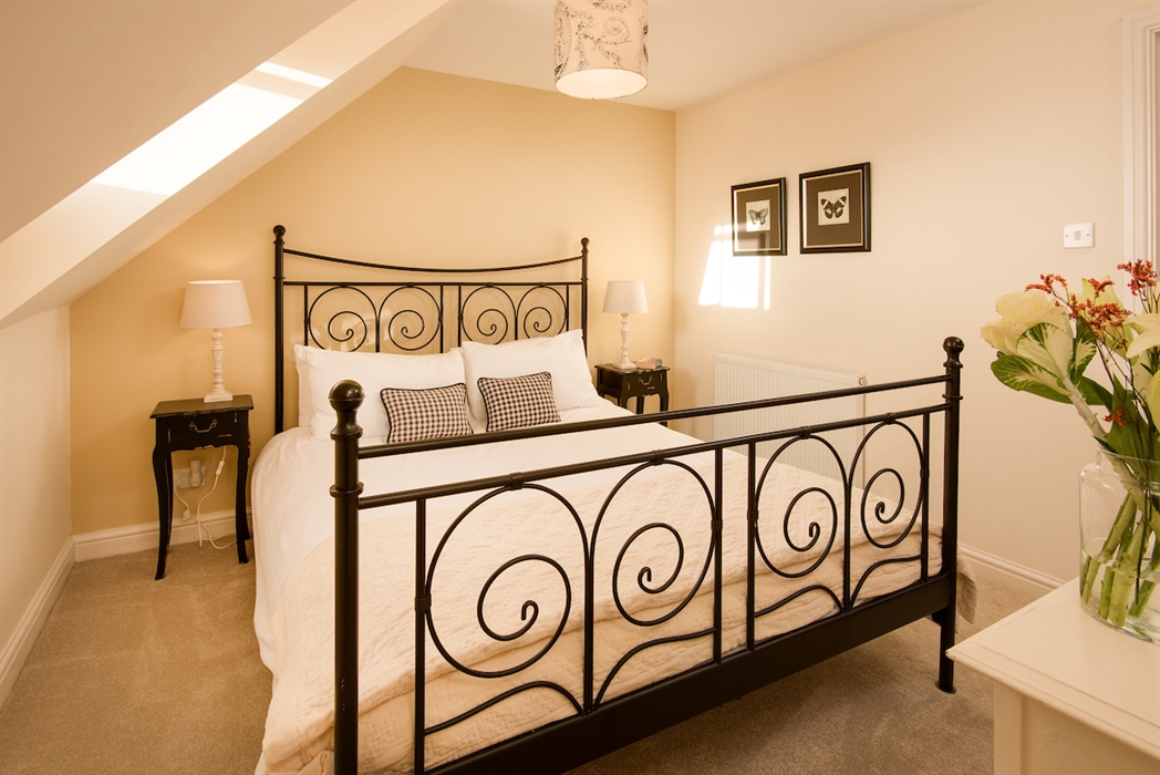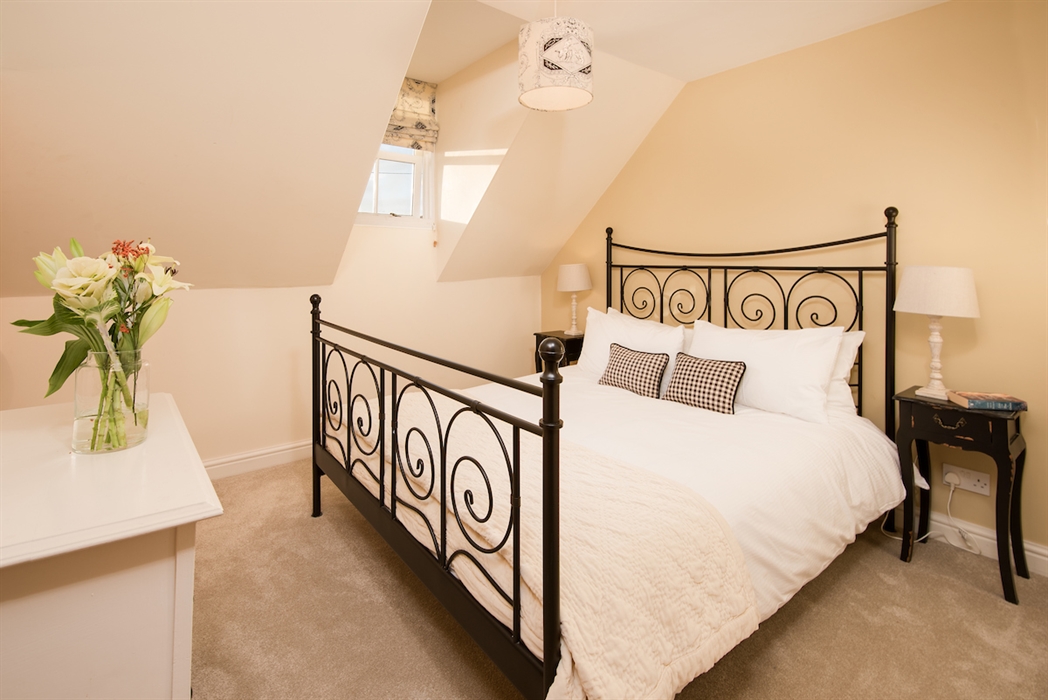 A pretty bedroom sits on the first floor with wrought iron bed and characterful coombed ceiling, along with the bathroom on this level.