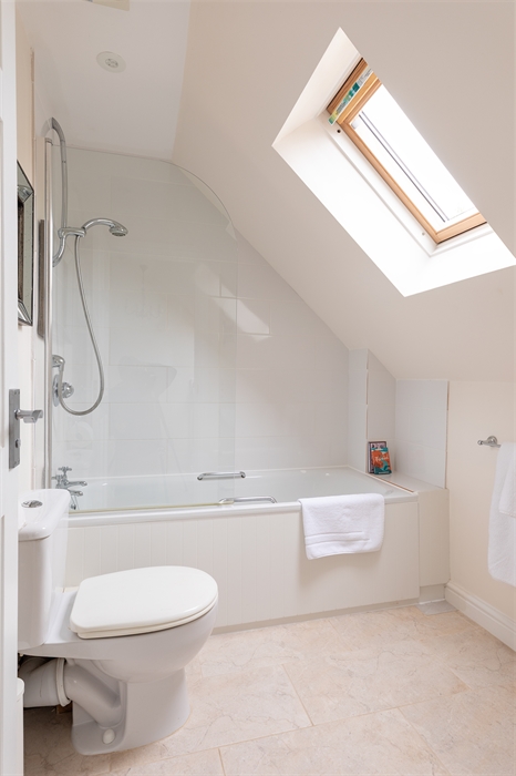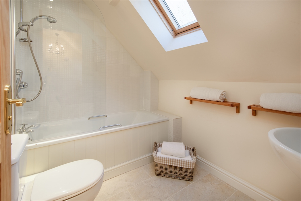 Bathroom with bath with shower over, heated towel rail, basin and WC.