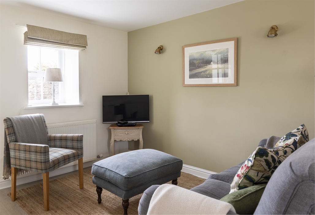 Sitting room with double sofa and armchair, flat screen TV and DVD player, door leading out to the patio area and garden.