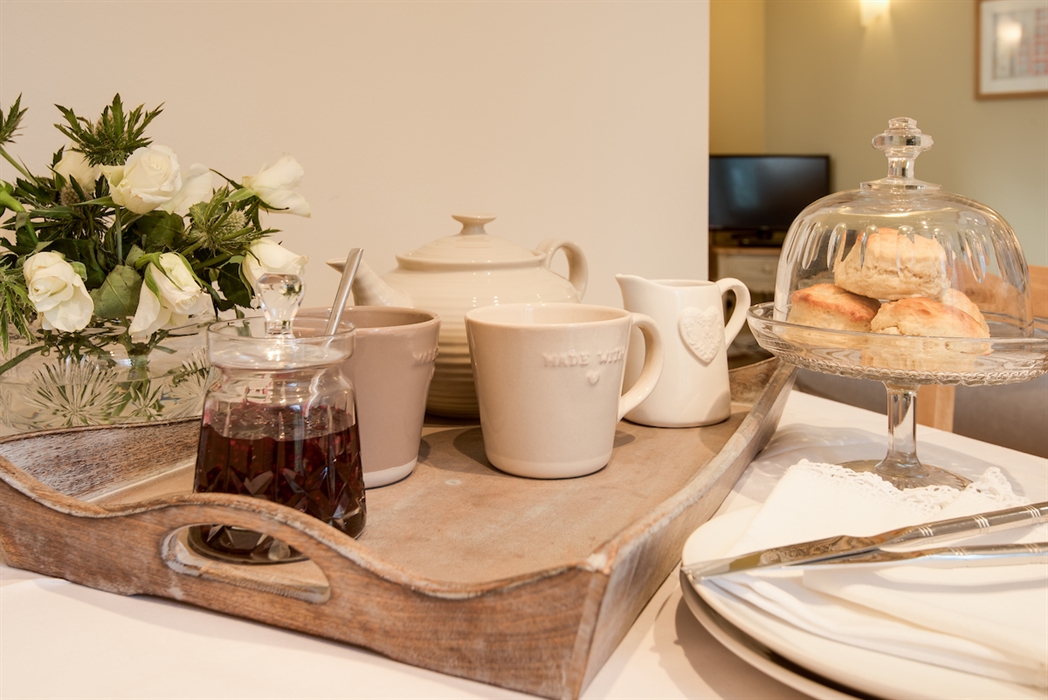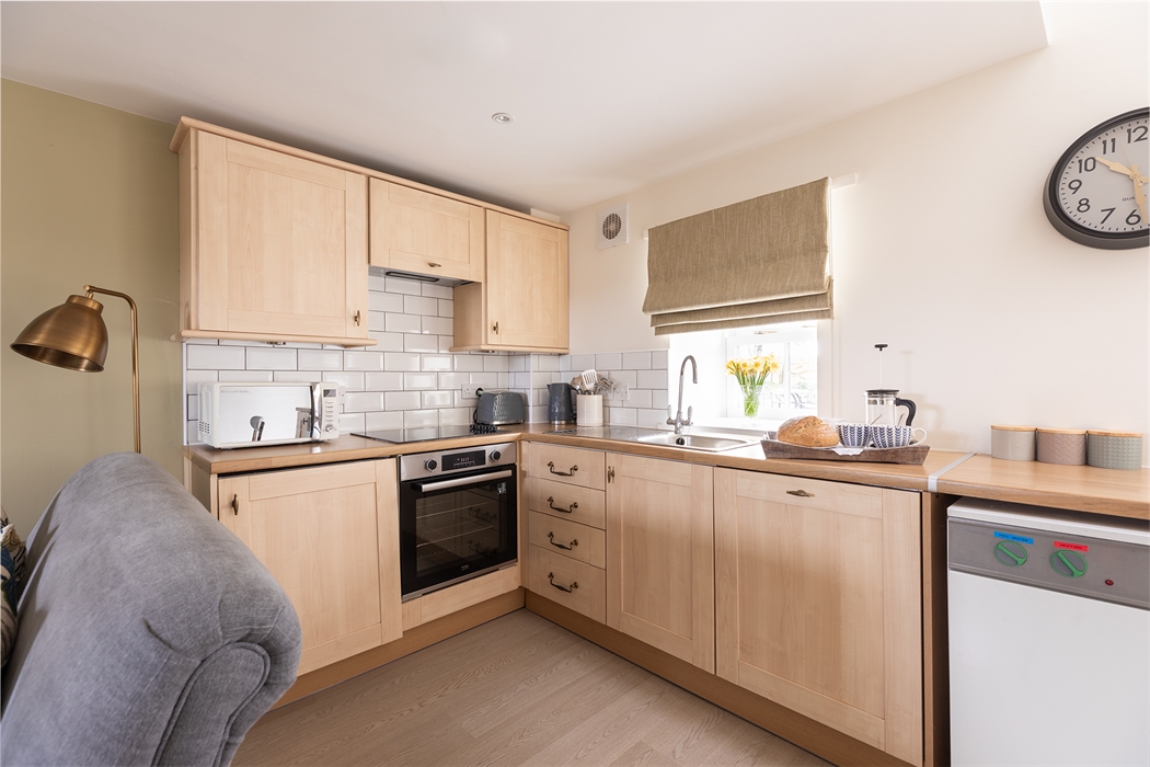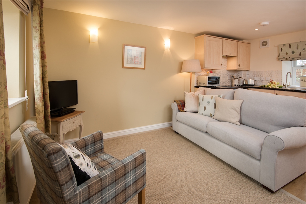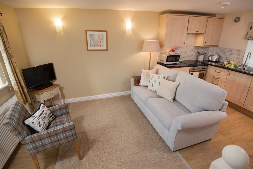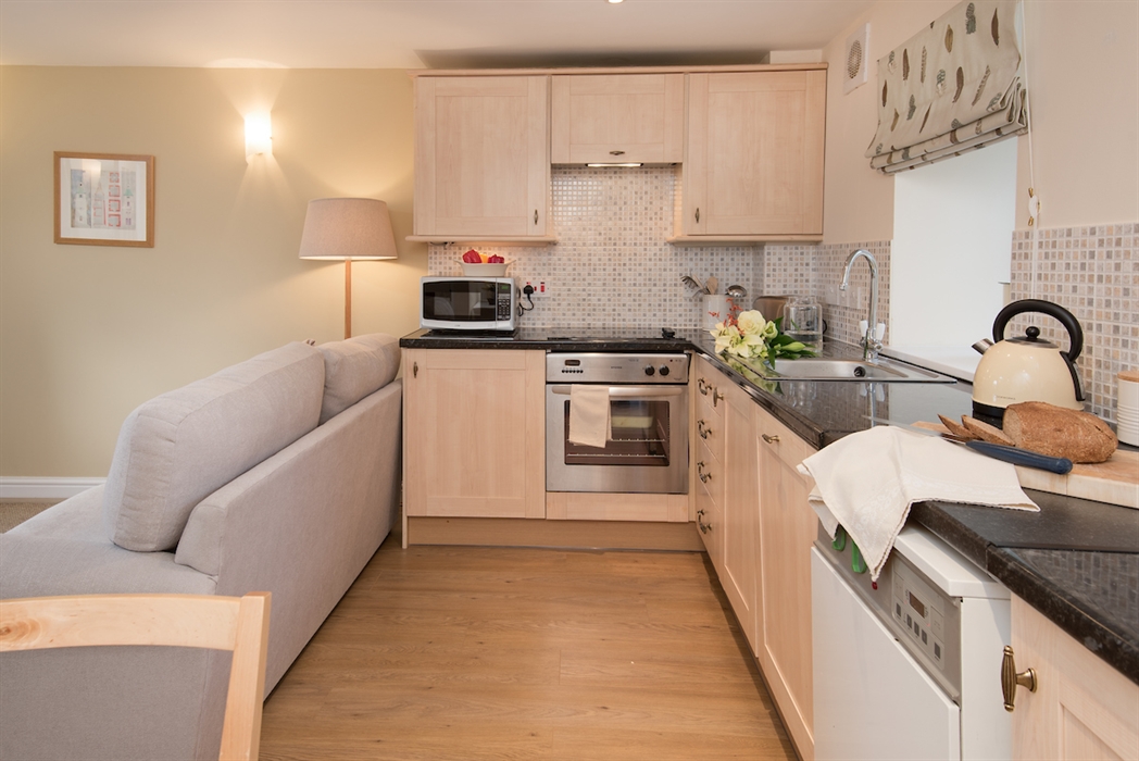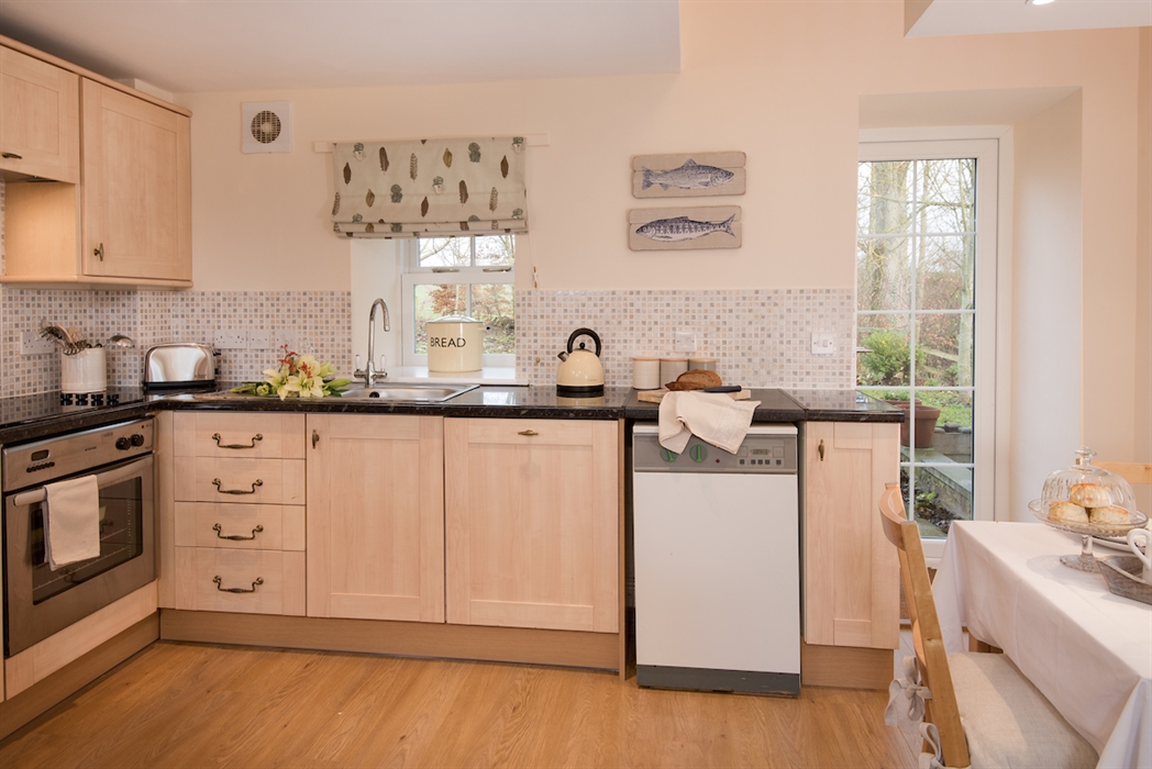 Kitchen is fully equipped with electric oven, ceramic hob, fridge, dishwasher, microwave. Dining table with seating for two. Washing and drying facilities are provided in an external laundry which is shared with two other cottages. A freezer is available for use in an external outbuilding.