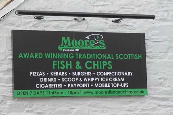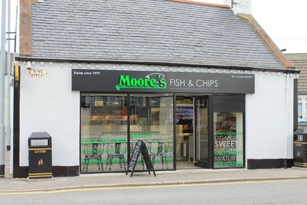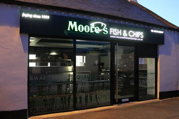 Welcome to the award winning Moore’s Fish and Chip Shop. Based in the picturesque “Food Town” of Castle Douglas, Moore’s Fish and Chip Shop offers a mouth watering menu with friendly, experienced staff and a welcoming atmosphere.