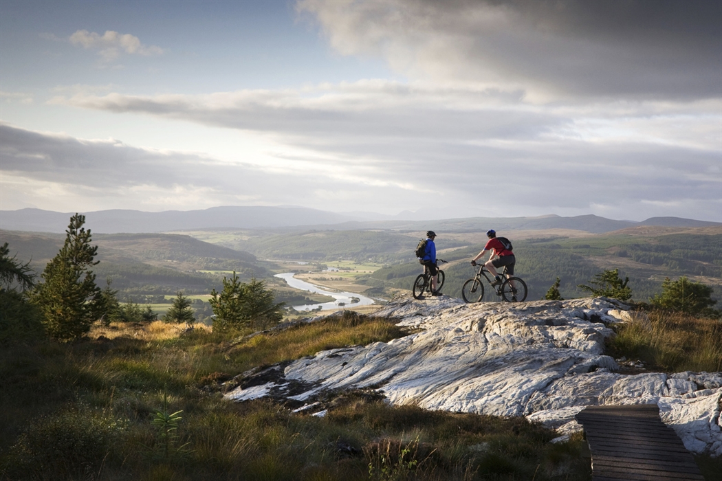 With grippy, flowing bedrock that you would swear was sculpted to ride on, and stunning views over the Kyle of Sutherland, Carbisdale Castle and surrounding hills, a trip to Balblair is an assault on all of the senses. The Balblair black trail, around 17kms in length, provides two to three hours riding at least. It is made up of roughly a third of bedrock, a third 'woodwork' (with boards, bridges and causeways), with the remaining third being hard-packed dirt, thanks to the high quality mineral soil. The wooden sections are coated with a rubber/sand paint which makes it grippy, even in the wet – it’s nearly as grippy as the rocks! Balblair Trails cater for the less experienced too with an extensive network of forest roads and the smooth flowing singletrack decent of the Ceilidh Trail. The more experience riders will test their skills on the strenuous climbing rock sections including ‘Hard Rock’ – a lung busting technical climb that you’ll be doing well to clear first time round. The gravity assisted sections include Candy Mountain – a combination of sloping bedrock and sweeping berms and the super fast ‘Loopy Loo’. There is even a very tricky hand cut decent on the section called ‘Slab Happy’. Variety is the name of the game at Balblair.