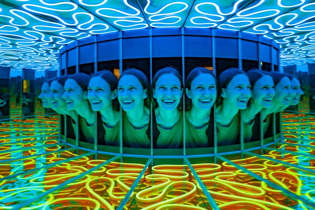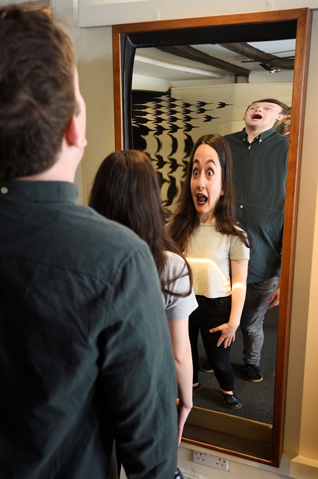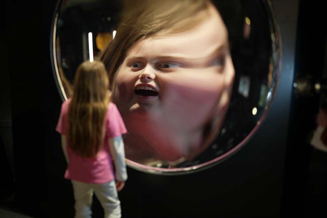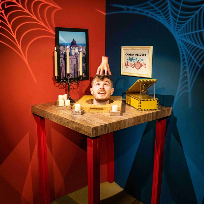 LIGHT FANTASTIC: Light Fantastic is our biggest gallery of interactive fun, tricks, and illusions – many unique to Camera Obscura. Count the reflections in our Kaleido Tunnel, discover our fun selection of holograms, step into a world of colour at our Colour Shadow Wall, and become a musical maestro with our Light Harp. The Ames Room is a brilliant piece of trickery, which can shrink and grow you instantly; try the Severed Head and keep a close eye on our Living Animal. Stop by our Kaleido-draw, transform yourself in the Morph Machines and while you're in the mood for transformation, the Meet Your Twin exhibit gives you a new perspective on yourself.