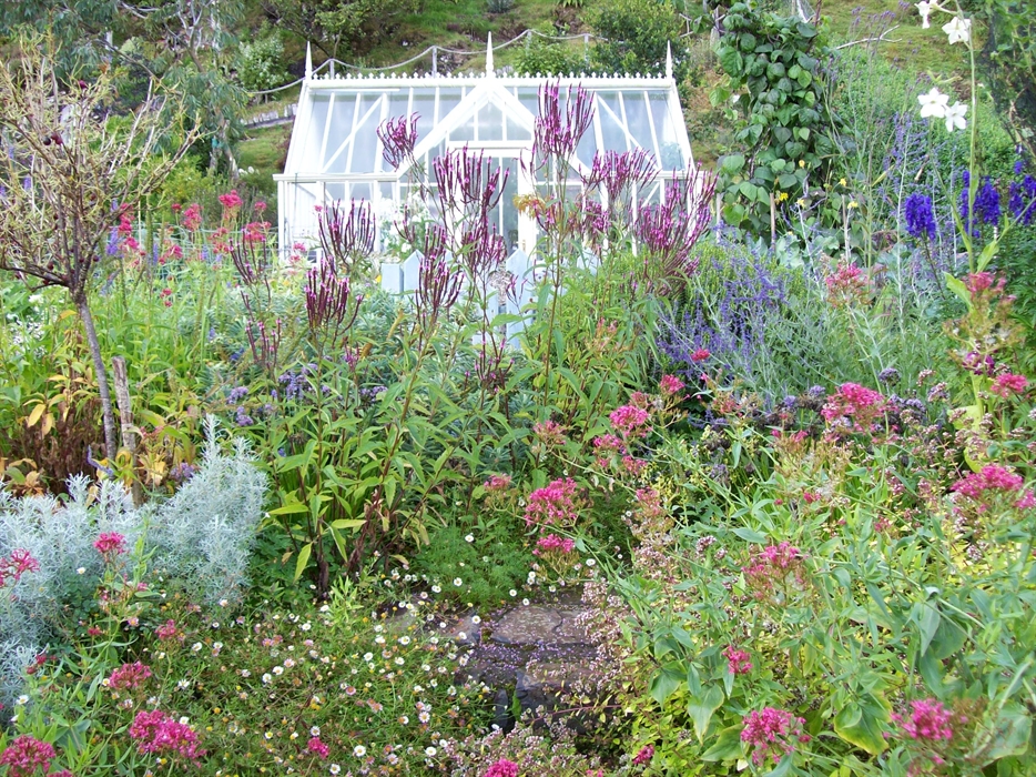 The path crosses the burn, lushly planted with moisture-lovers such as rogersia, sanguisorba and astilboides tabularis, and winds up the hillside through an eclectic mix of colourful herbaceous plants, wind-hardy shrubs, including several species of olearia and ozothamnus, and exotic non-natives such as echiums, all of which thrive in this mild but wind-swept location. There is a seating area at the top where one can enjoy the breathtaking view among plantings of agapanthus, bottle-brushes, sedums and rambling roses.