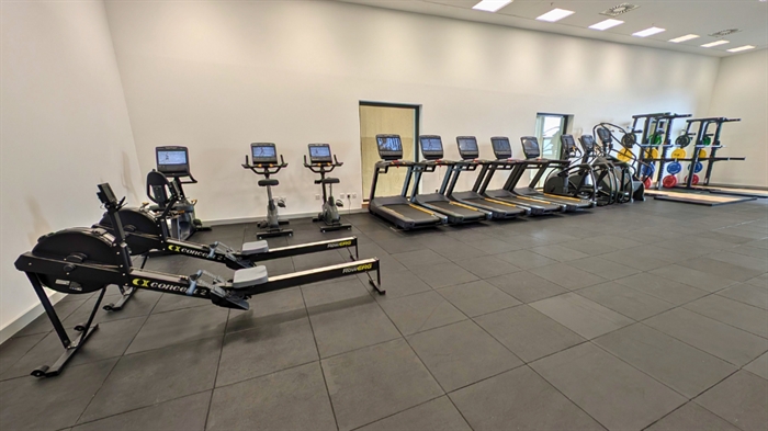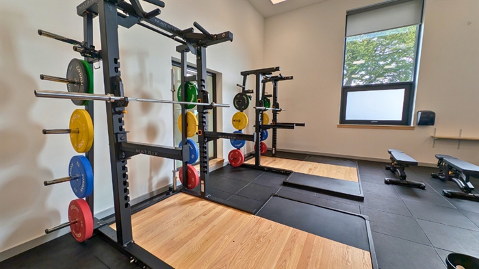 Strength: smith machine, leg press, dumbbells and two half racks with Olympic lifting platforms.