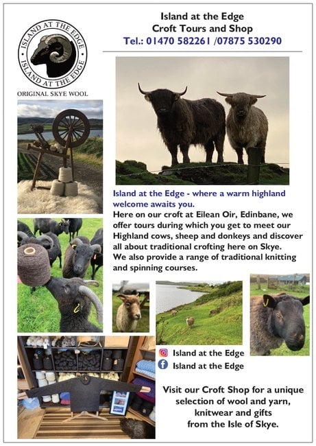 And if a boat trips isn’t for everyone in your party then why not book a croft visit to meet our sheep and Highland cows or learn to knit or spin with the wool from the sheep. These are run by Yasmin’s business ‘Island at the Edge’. The boat trips and the croft visits are all operated from our working croft on the shore of Loch Greshnorish, Edinbane, on the road from Portree to Dunvegan Castle.