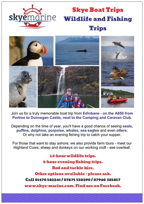 Join Skye Marine for a truly memorable wildlife boat trip from our own pontoon on the shore of Loch Greshornish, Edinbane - on the road to Dunvegan Castle from Portree. You'll head out into Loch Greshornish then on to Loch Snizort and Loch Diubaig and, depending on the time of year, you'll have a great chance of seeing seals, puffins, dolphins, porpoise, Minke whales, sea eagles and even otters + an abundance of other marine mammals and seabirds around some of the remote, uninhabited islands that we visit. Our experienced skipper will take you to the very best locations that can only be accessed by boat, like the Eas Tardil waterfall and the Ascrib Islands. Don’t forget to bring your camera!!