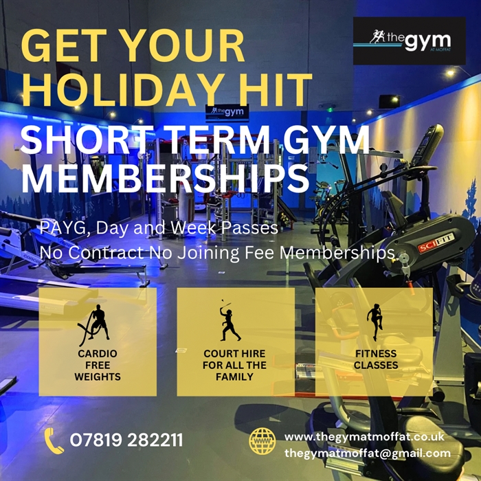 Spacious 24/7 high spec Gym and Fitness facility open to everyone at the top of Moffat town centre near the tennis courts . Cardio, strength and functional equipment. Family friendly Court hire, pickleball, badminton and more. Holiday use.