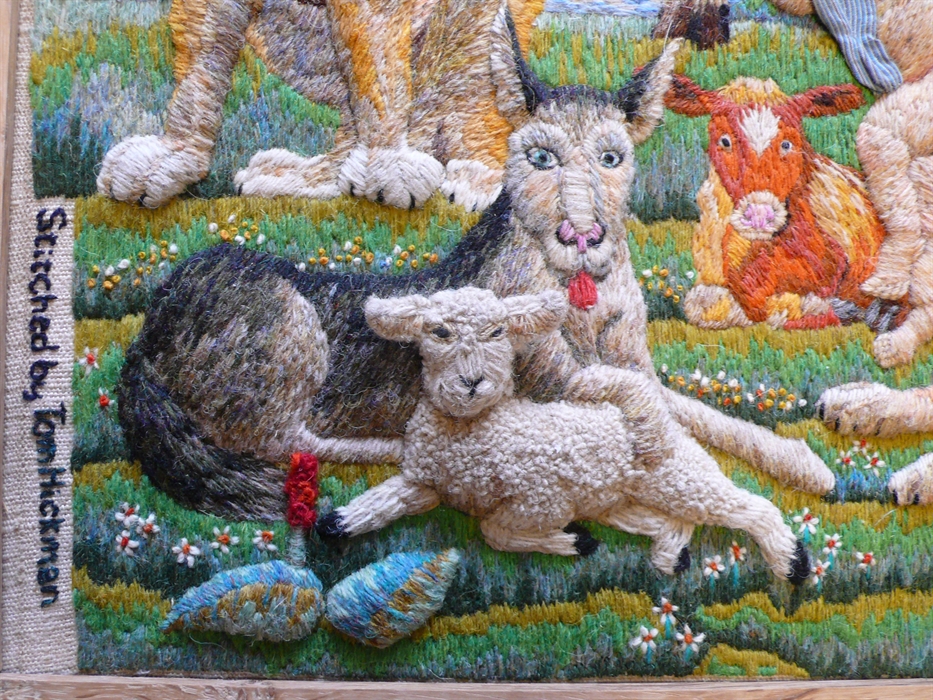Tom uses tweed wools in his version of stump work finding the uneven distribution of colour within the thread ideal for his purpose. Having spent many years painting en plein air Tom is quite used to having an audience while he works but a man seen stitching in public has to be seriously good.