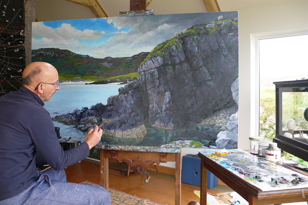 Enter his studio and you will find it filled with “tools of the trade”, artist’s easel central, with paint, sketch pads and jugs bristling with brushes. Bobbins and discarded yarn fill shelves along with shells, animal bones, drift wood and feathers, while sculptures, needlework and finished canvases are displayed throughout the gallery. Sheep and wool are a way of life in the Outer Hebrides and they soon began to influence his creative work. The scent of peat and the rasp of Harris Tweed enhance his folk art images of local sheep while the intricacy of his stump work embroidery will remind visitors that he is now part of that noble tradition of embroiderers that stretches as far back as the middle ages.