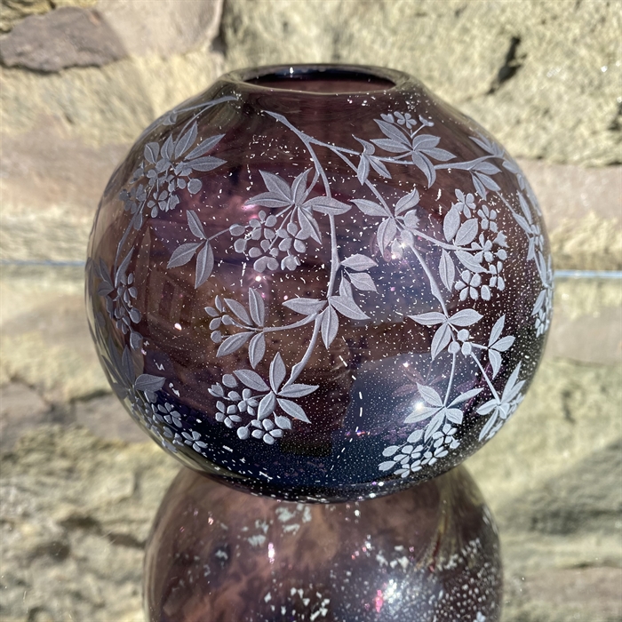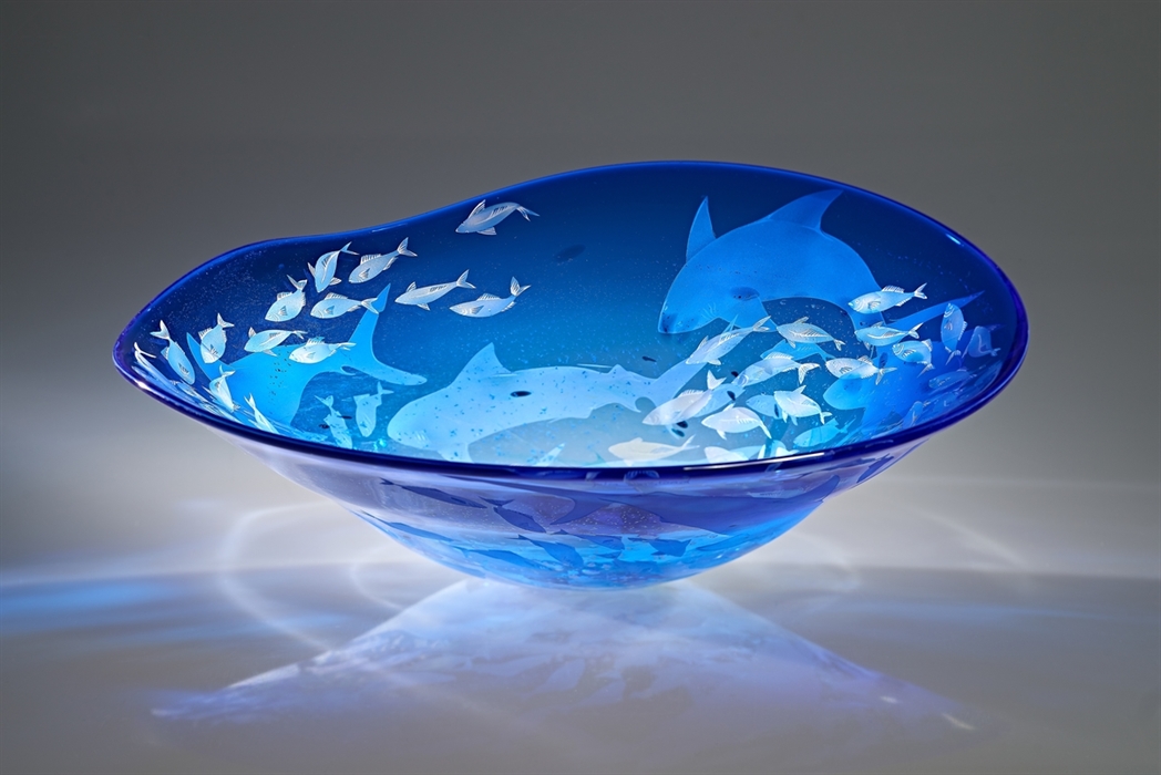 Julia designs and decorates handblown 24% lead crystal bowls in jewel like colours with unique patterns which she sketches and then sandblasts into the surface of the glass. Drawing her inspiration from nature and especailly the sea Julia's patterns include fish, flowers, butterflies and dragonflies amongst many others.