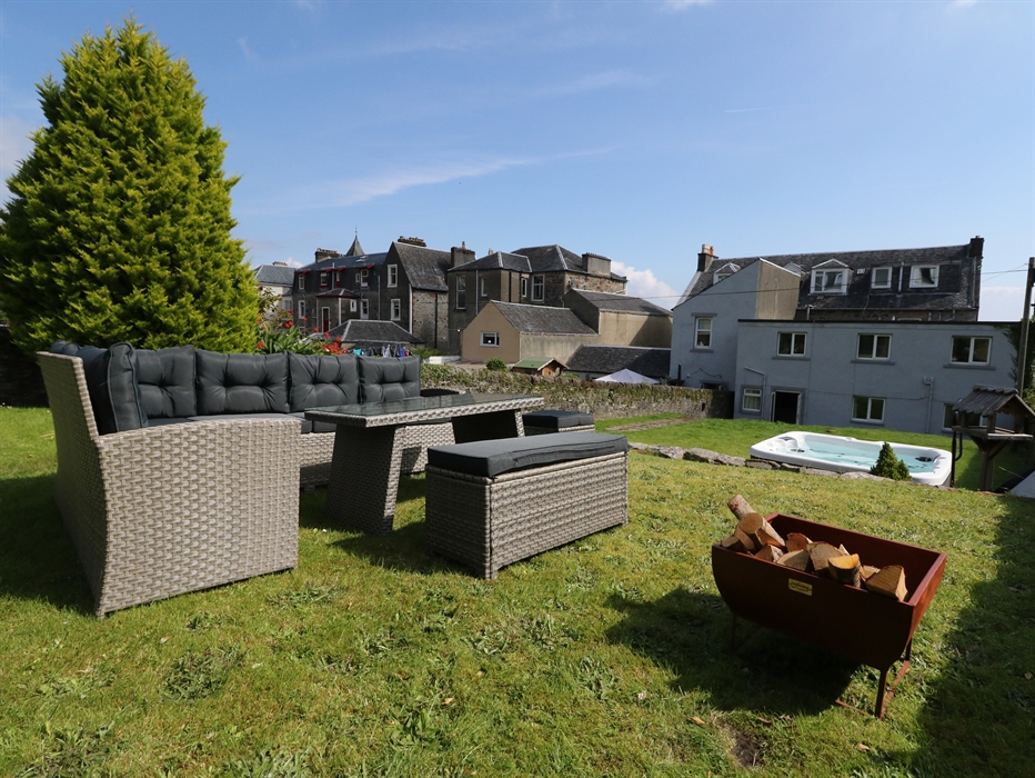 Lawned garden with new, external, waterproof seating and new hot tub as well as additional lounge area