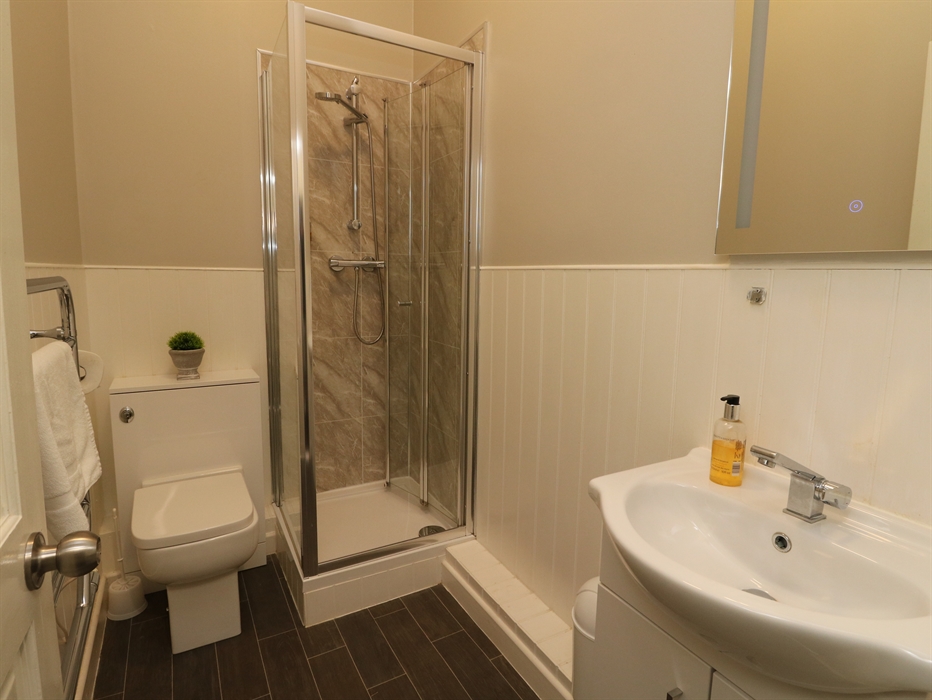 Room 2: First floor single bedroom with TV and en-suite shower, basin, heated towel rail and WC