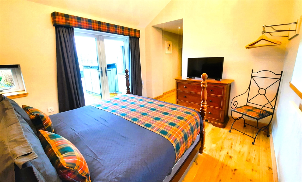 The accommodation is over two floors with a ground floor King size ensuite bedroom which has French doors to the patio and hot tub, there are doors out from the sitting room as well. The modern kitchen is well equipped but if you are looking for a proper rest from normal life there is plenty of choice for eating out in Rowardennan, Balmaha, Drymen and slightly further afield at Balloch and Duck Bay.