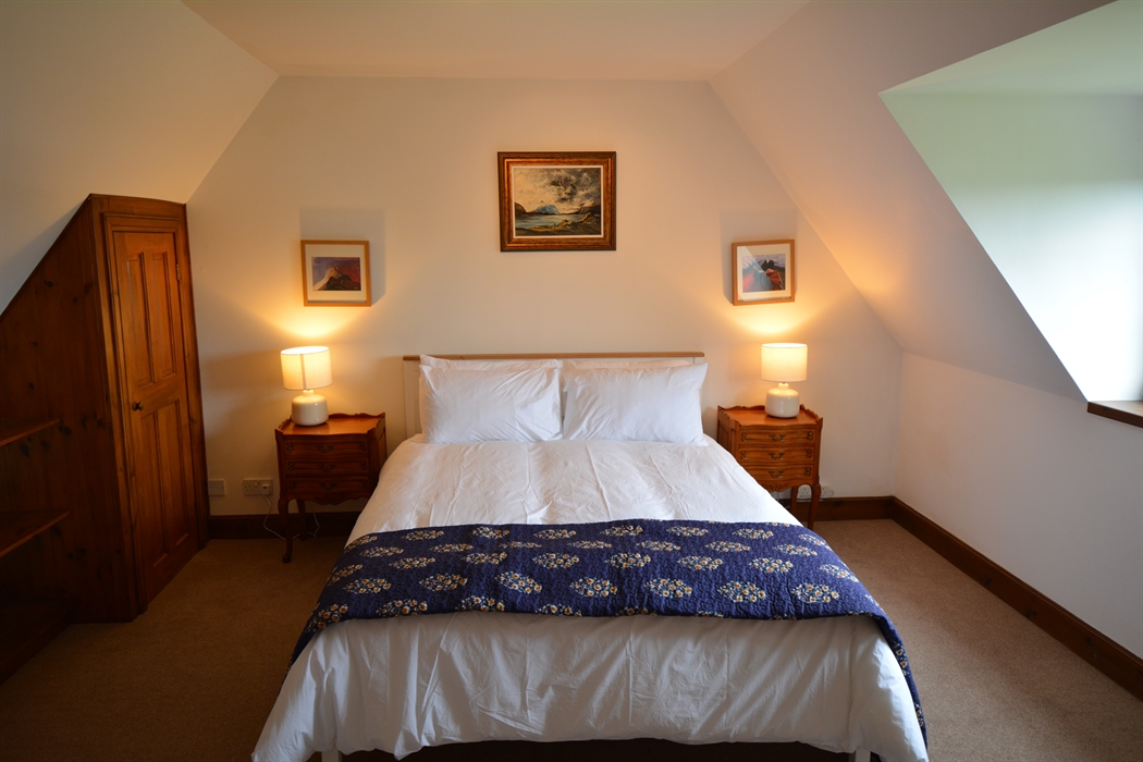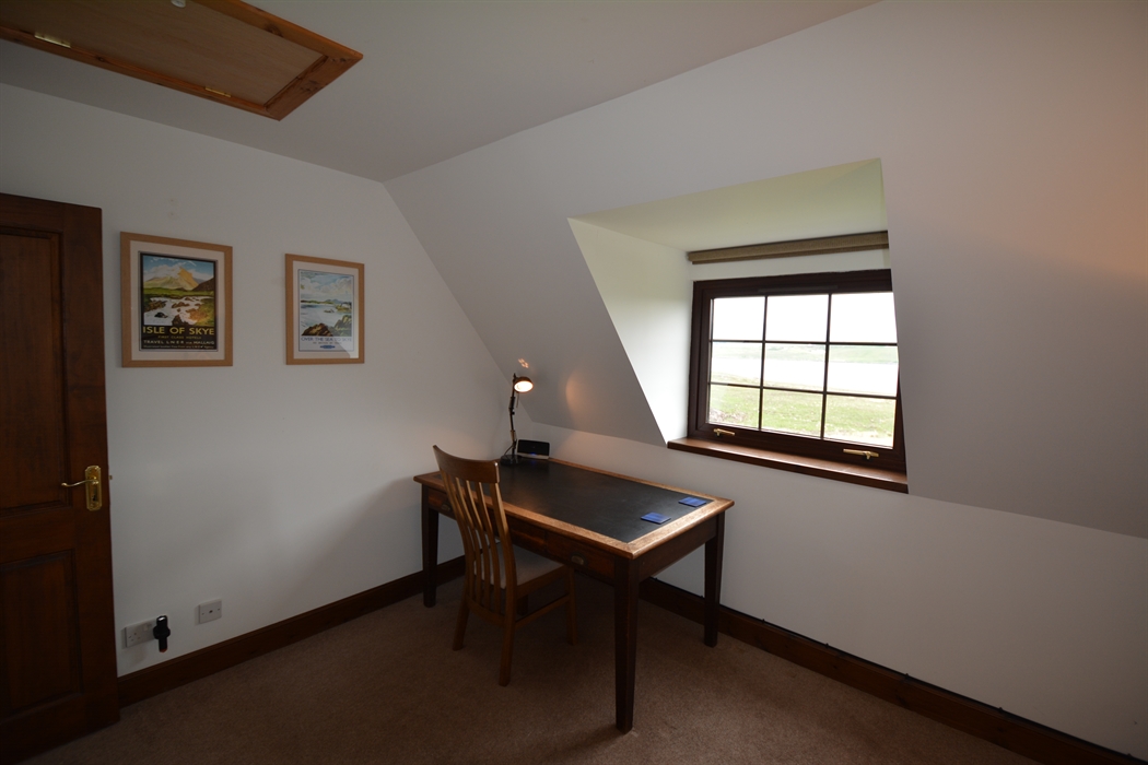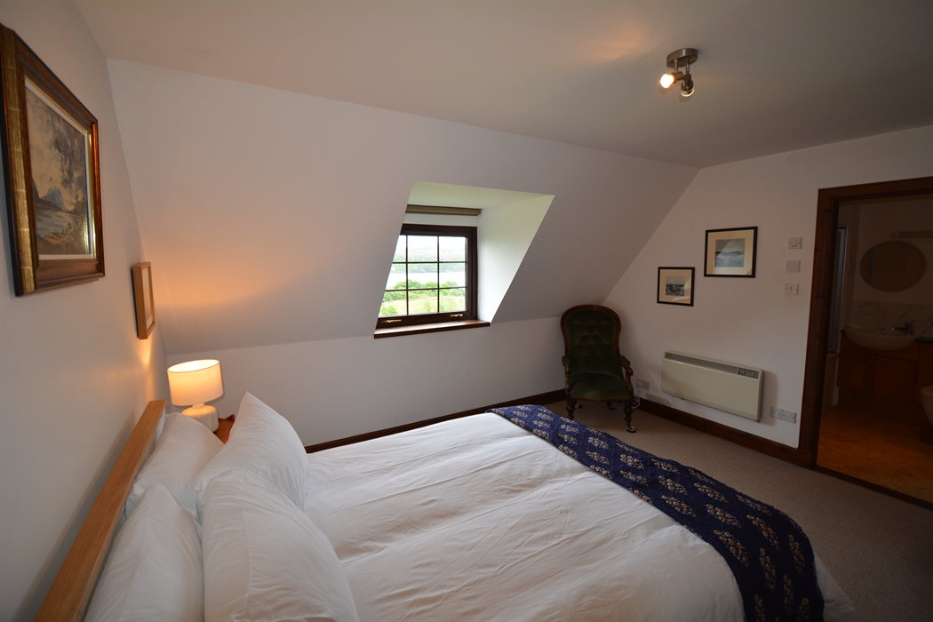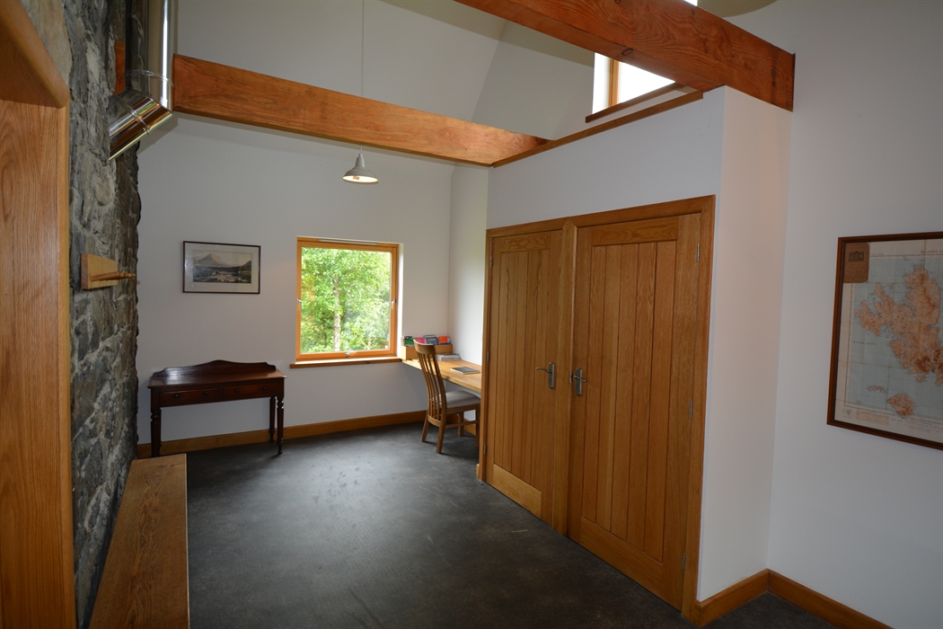 Inside, the house is comfortable, light, and spacious, yet cosy. You’ll enter the house via a hall extension, which gives you plenty of space to leave boots and outdoor clothing. We have kitted out the kitchen as you’d expect to find a home away from home, including local stoneware. There’s comfy seating, a multi-fuel stove, and TV in the living room. There are four generous bedrooms, which can accommodate up to 7 guests. The main bedroom suite is on the ground floor, and has a super-king bed plus en-suite bathroom with shower cubicle, bidet, and toilet. There’s also a separate toilet and utility downstairs. Upstairs, you’ll find the other three bedrooms – a king-size with an en-suite bathroom with over-bath shower and toilet; twin bedroom (two singles, that can be converted into a super-king, depending on your requirements); and a single bedroom. Every bedroom has views of the loch, and high coombed ceilings. There is also a separate shower room with toilet, as well as a study upstairs, should you need some peace and quiet. We have provided a range of DVDs, our favourite board games, books, and guides in the upstairs hall, to keep you busy whilst at home and help you plan where to explore! We have decorated the house with a wide range of twentieth century and contemporary Scottish – including local – art.