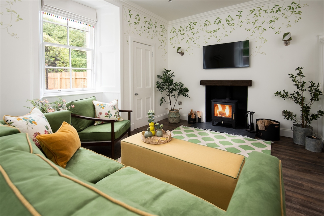 Sitting room with large sofa, chair, footstool, rocking chair, wall-mounted Smart TV, wood burner.