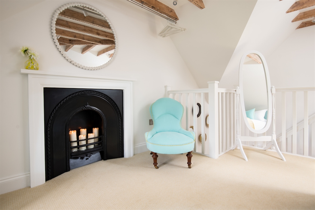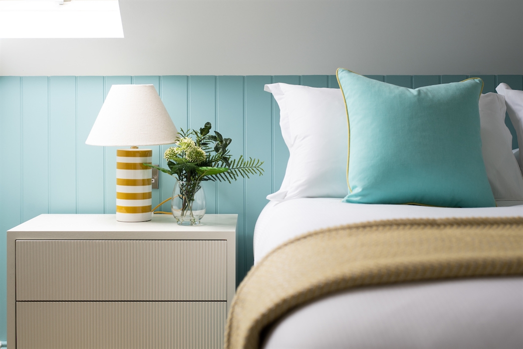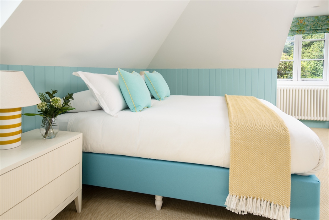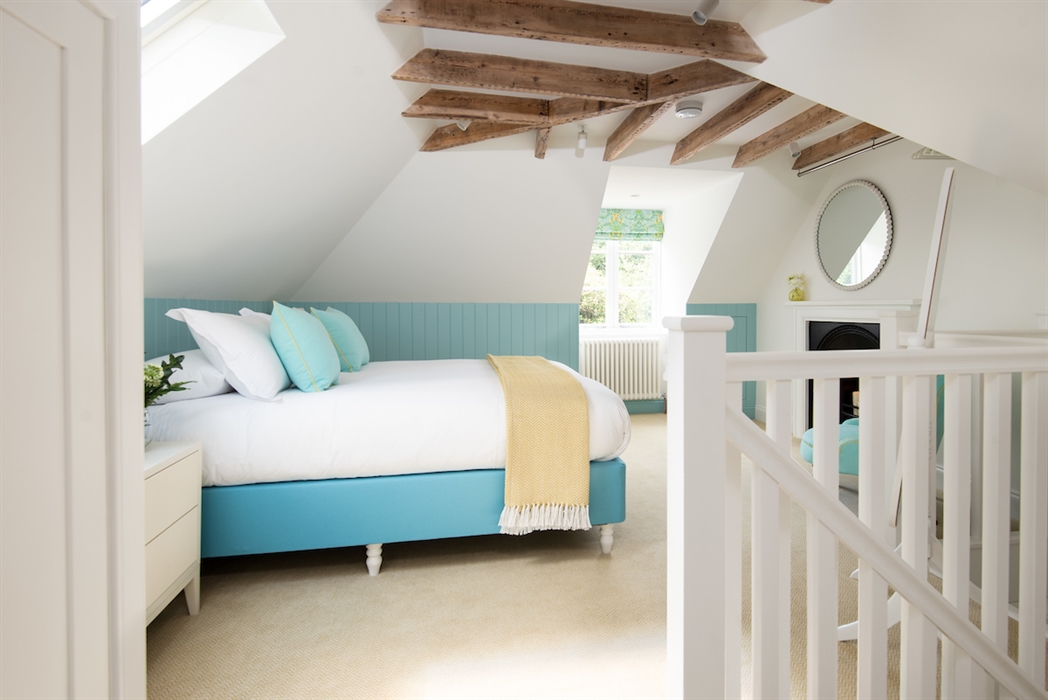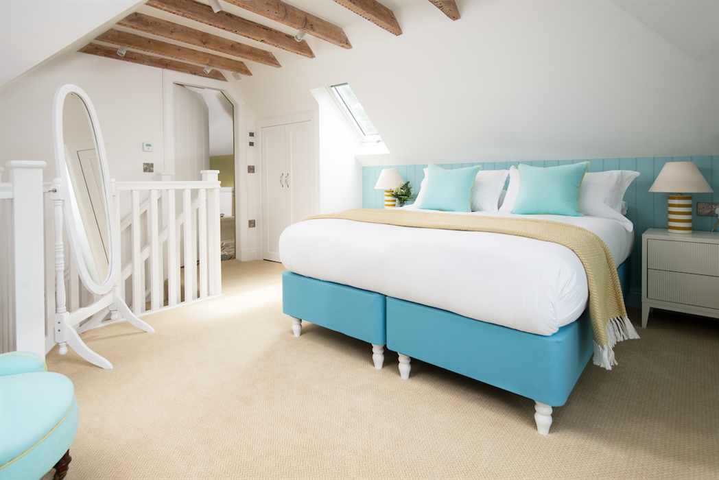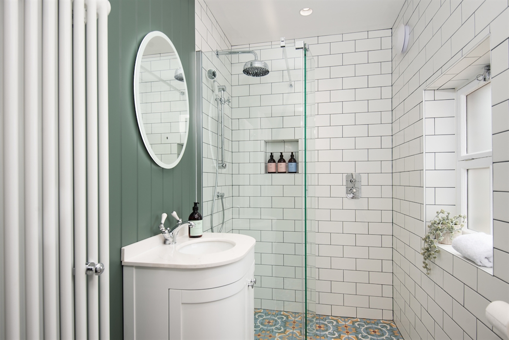 The bedroom can be found on the second floor of the cottage, with a king size bed set beneath a combed ceiling with original wooden beams. Cosy furnishings and baby-blue wall panelling create a calming atmosphere and a stylish ensuite bathroom lies next door. With olive-green panelled walls, patterned tiles, and a clawfoot freestanding bath, it’s the perfect place to unwind. Another handy bathroom can also be found on the ground floor, with sleek white tiles and a rainforest shower.