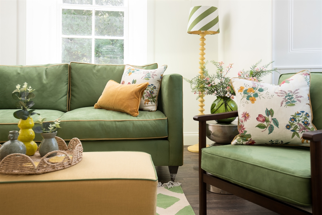 On entering through the main door, you’ll be met with the open plan living area. To the left, cosy green furnishings gather around a log burner and painted leaves flutter down from the ceiling, connecting the interior to the verdant gardens which lie outside the window. The furniture includes bespoke and repurposed pieces from Scottish artisans, including colourful handmade lampshades and reupholstered furniture full of character. This is a blissful place to start the day on a summer’s morning as well as a warm and inviting spot to cosy up on a winter evening.