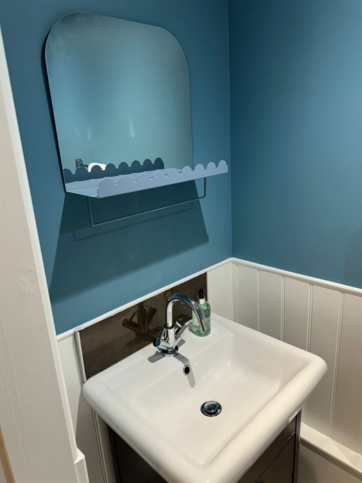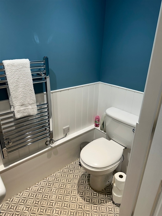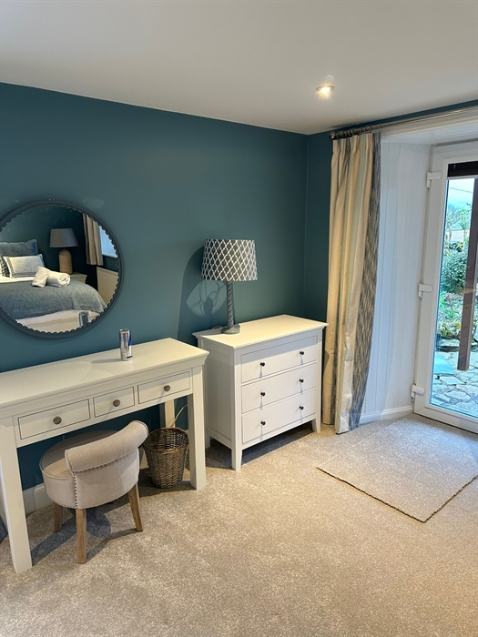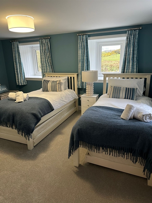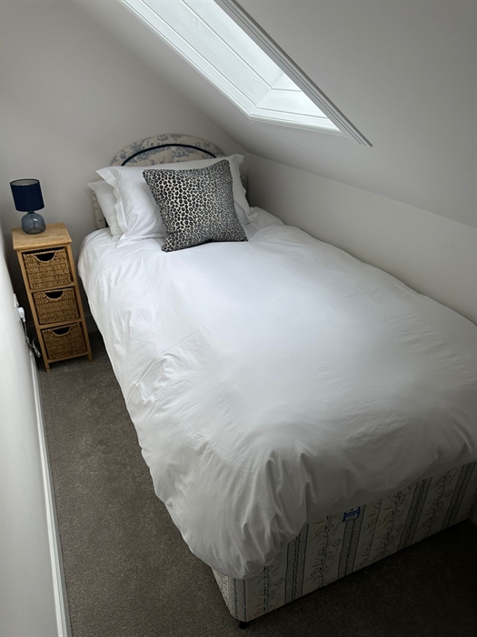 Accommodation for 5 over 2 floors: Ground floor: Master bedroom super King size bed with en-suite bathroom with over bath shower and access to the secluded front patio Family bathroom comprising of bath with hand held shower attachment, wash basin and WC. The second bedroom is a twin beds with en-suite shower room. In-between the upper floor rooms, there is a cosy single bedroom, where you could enjoy some star gazing from the Velux window. First Floor: Large living room with glass gable leading to balcony providing stunning sea views and multi fuel stove, fully fitted Kitchen.