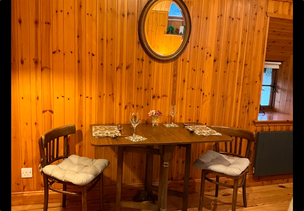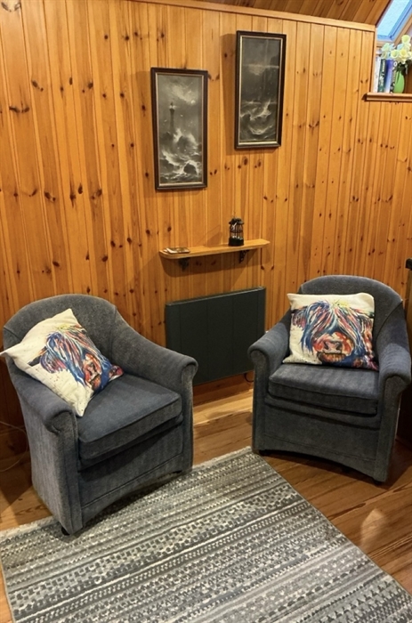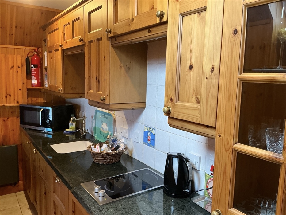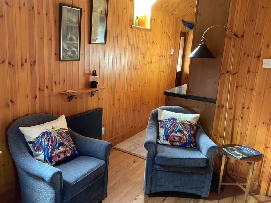 Refurbished for 2023 the cottage sleeps two in studio style accommodation with a comfortable double bed and two armchairs, a TV with DVD, and a dining able and chairs, all in the open plan living / sleeping area. There is a well equipped galley style kitchen adjoining the living area, with a combination microwave oven and grill and built in fridge, dish washer, two ring ceramic hob and even a washer/dryer for laundry. Just off the entrance hall is the shower room with a walk in electric shower, wash hand basin and w.c.. The entrance hall also offers a built in wardrobe and storage space.