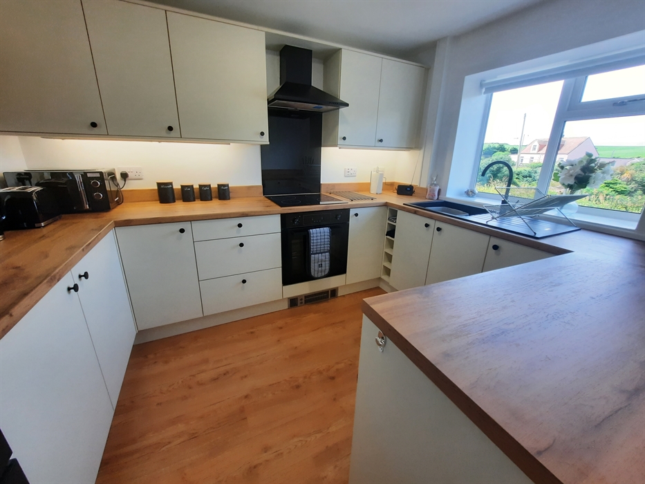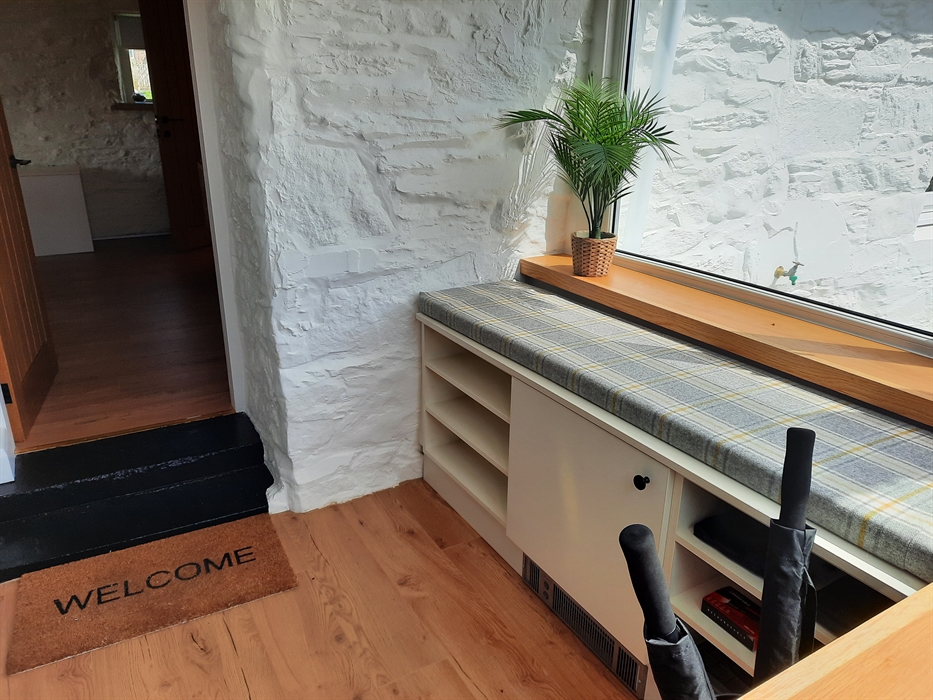 Accommodation for four all on one floor: Entrance door leading in to a vestibule with a sunny window seat and coat & boot storage; 2 steps up into the open plan living area with Double sofa bed and wood burning stove (no fuel provided), double sofa bed and smart TV; Fully fitted modern kitchen; Bedroom with Double bed and ‘Jack ‘n’ Jill’ bathroom (which is also accessed from the living area), with over bath shower, hand held shower attachment, wash basin and toilet.
