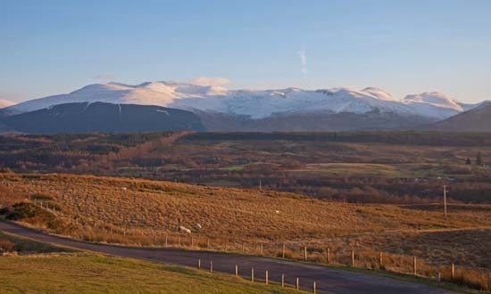 From the station at Banavie cross the road bridge over the adjacent Caledonian Canal and turn imediately right onto the B8004. The road passes through a number of houses but leads fairly quickly out into open countryside. After undulating for almost 8 miles with great views across the canal and River Lochy to Ben Nevis take the right fork to drop down a short hill and cross the canal at Gailochy. An alternative, traffic free way of reaching this point is to follow the canal tow path from Banavie.