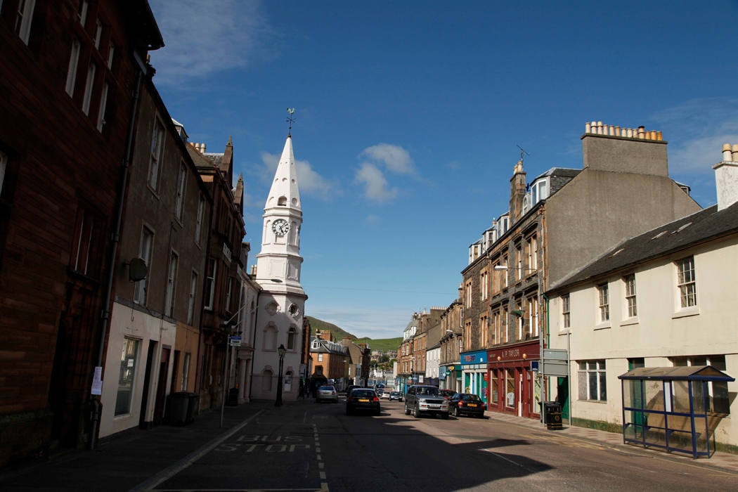 The main street through the centre of Campbeltown with the town house spire visible, Kintyre, Argyll.