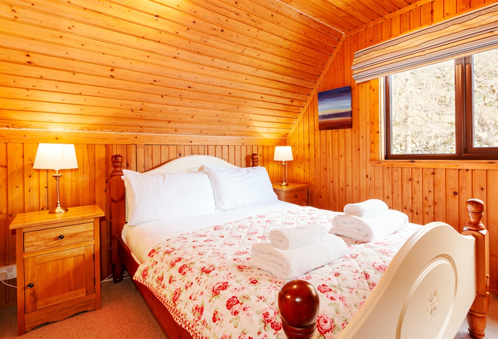 This two-storey wooden self catering holiday lodge has three separate bedrooms including two with ensuite showers, a large open plan living and dining area with separate kitchen, bathroom and two balconies with furniture.