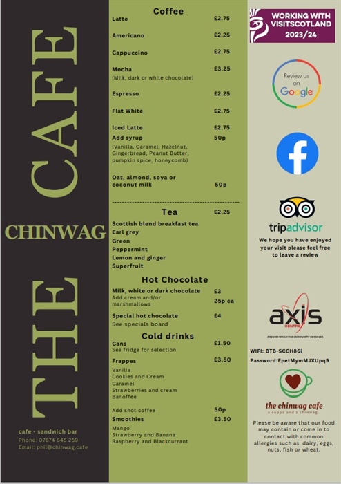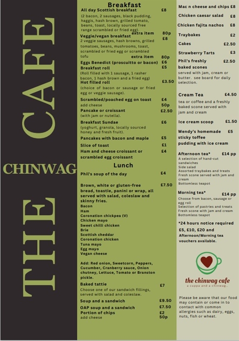 The Chinwag Cafe is a small locally owned business in the village of Newmachar. We provide a varied menu, full of fresh, locally sourced ingredients. Home bakes, breakfast, lunch and snacks. Hot drinks and also Afternoon teas.